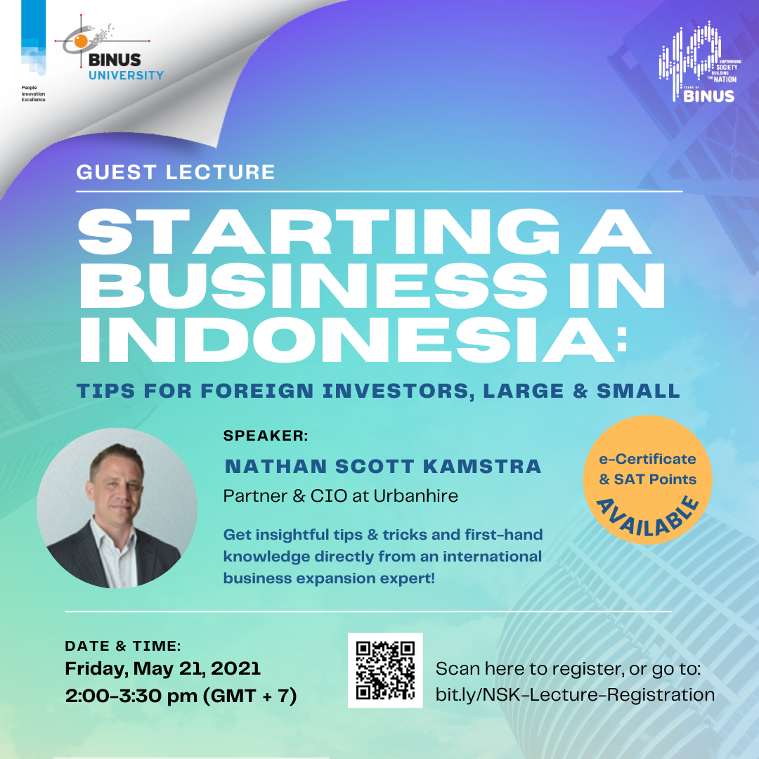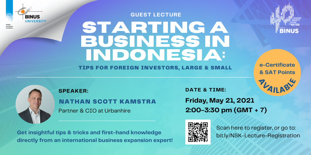 [BINUS GLOBAL Partners From Jan 2020] INVITATION - Guest Lecture with Nathan Scott Kamstra - Starting a Business in Indonesia: Tips for Foreign Investors, Large & Small
