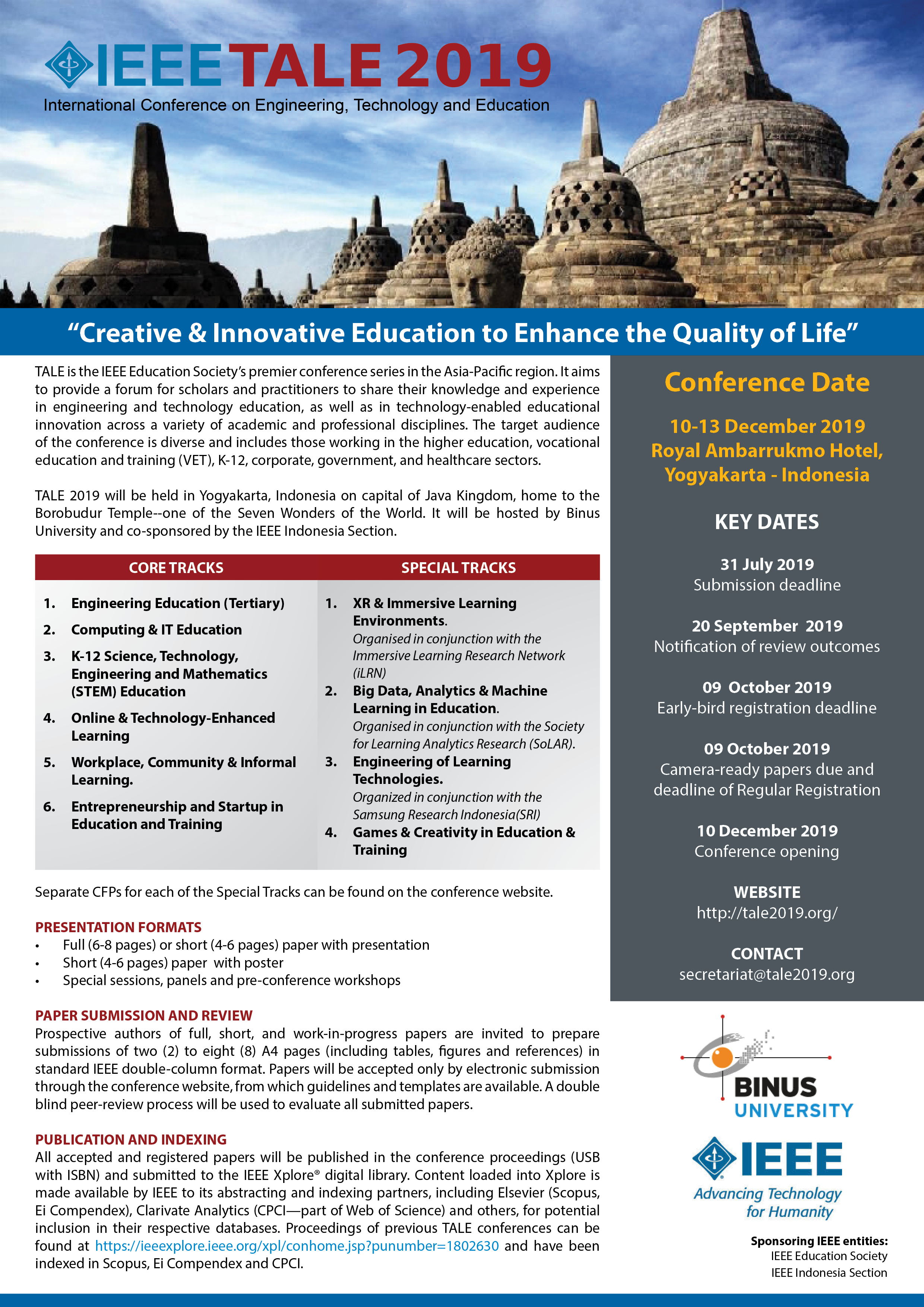 TALE 2019 will be held in Yogyakarta, Indonesia from 10 to 13 December 2019 on capital island of Java, home to the Borobudur Temple--one of the Seven Wonders of the World. It will be hosted by Binus University and co-sponsored by the IEEE Indonesia Chapter.