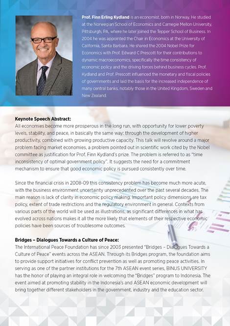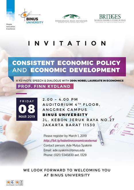 We cordially invite you to our seminar event with the 2004 Nobel Laureate in Economics, Professor Finn Kydland on Friday, March 8, 2019 at 2 - 4 pm at Auditorium, 4th floor, Anggrek Campus, BINUS University, Jl Kebon Jeruk Raya No. 27, Jakarta Barat 11530.