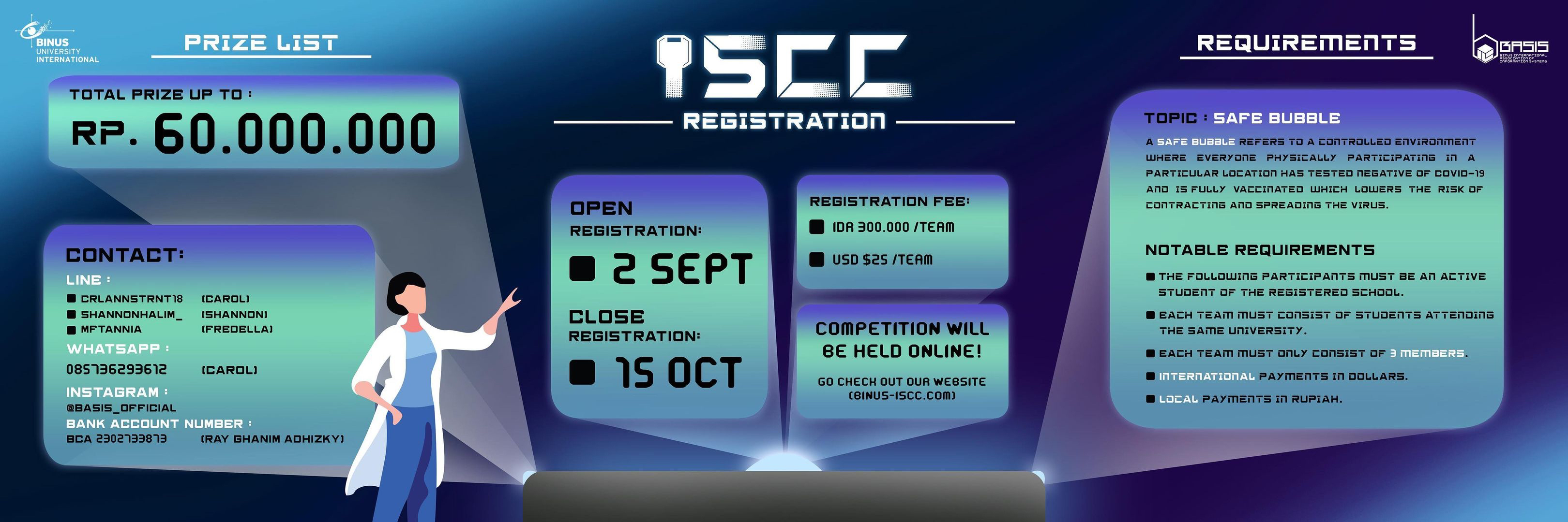 If your school is interested to participate, you can directly visit www.binus-iscc.com<http://www.binus-iscc.com/> for registration or contact us at binus.iscc2021 at gmail.com<mailto:binus.iscc2021 at gmail.com>