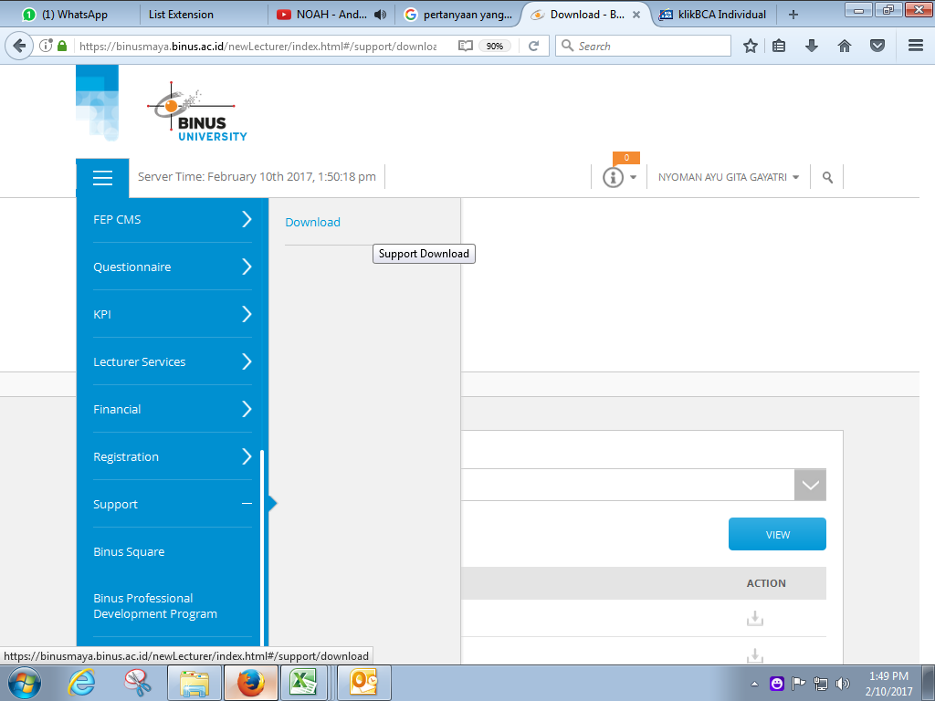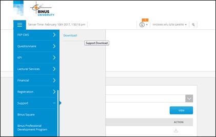 1. Login binusmaya 5 --> klik menu --> pilih menu "Support" --> klik download.
