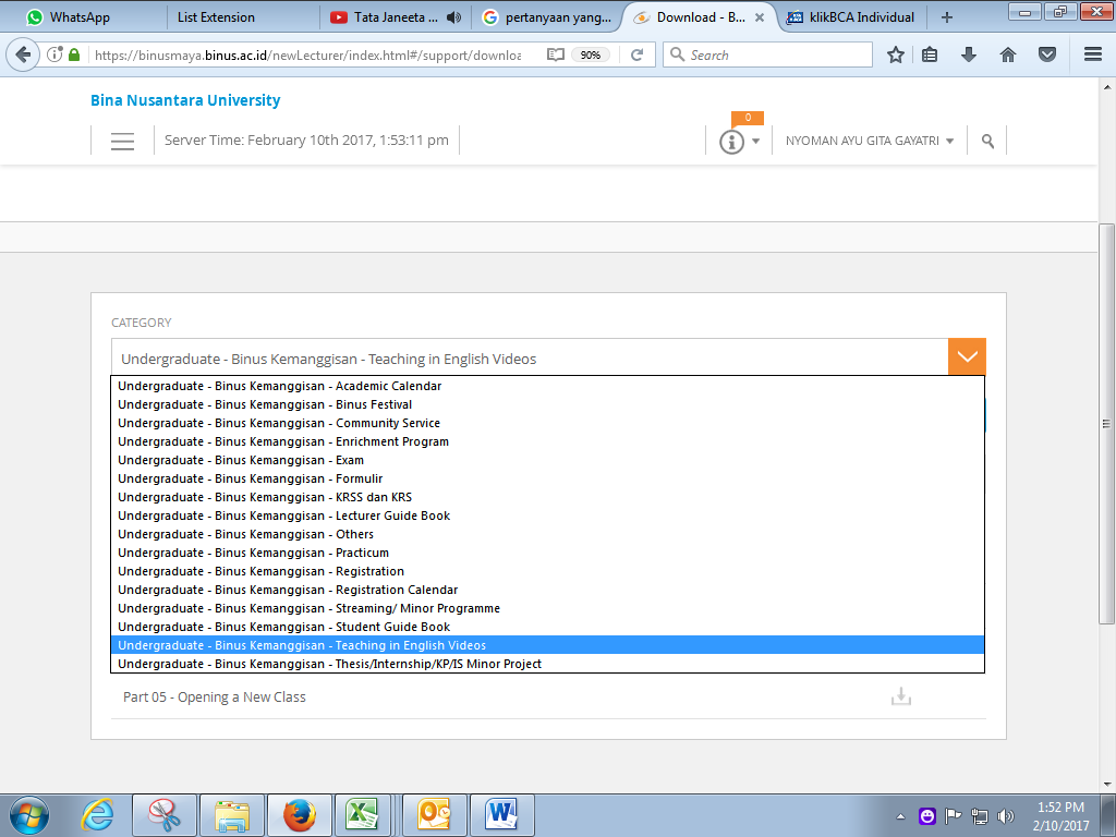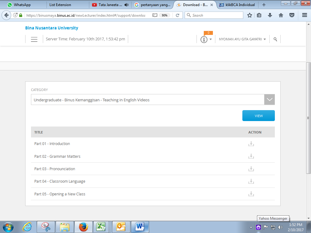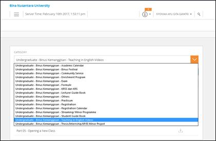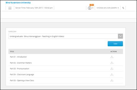 1. Setelah klik download maka akan masuk ke halaman pemilihan kategori --> pilih kategori "Undergraduate - Binus Kemanggisan - Teaching in English Video --> klik view.