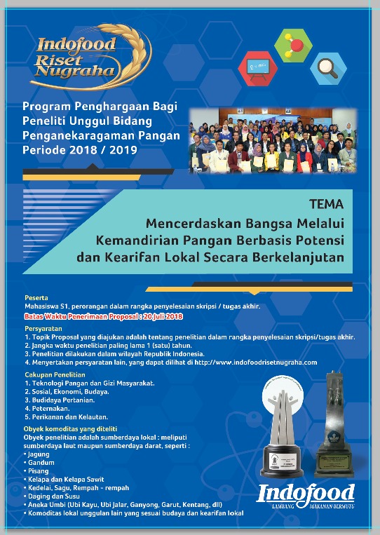 Bersama ini kami sampaikan Poster Program Indofood Riset Nugraha 2018 - 2019. Program Indofood Riset Nugraha 2018 - 2019 adalah bantuan peneliti bagai mahasiswa S1 yang telah duduk di semester VI.