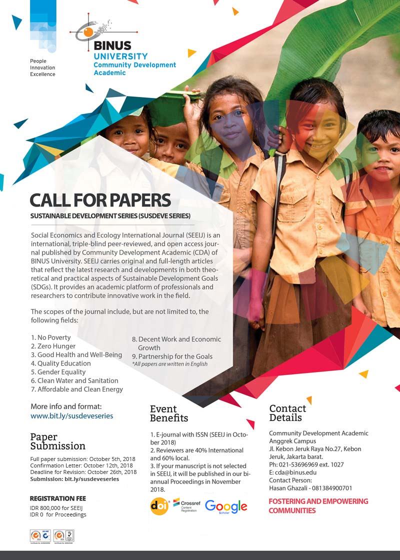 We would like to invite you to contribute to one of our prestigious journals, SEEIJ. Social Economics and Ecology International Journal (SEEIJ) is an international, triple-blind peer-reviewed, and open access journal published by Community Development Academic (CDA) of BINUS University. SEEIJ carries original and full-length articles that reflect the latest research and developments in both theoretical and practical aspects of Sustainable Development Goals (SDGs). It provides an academic platform of professionals and researchers to contribute innovative work in the field.