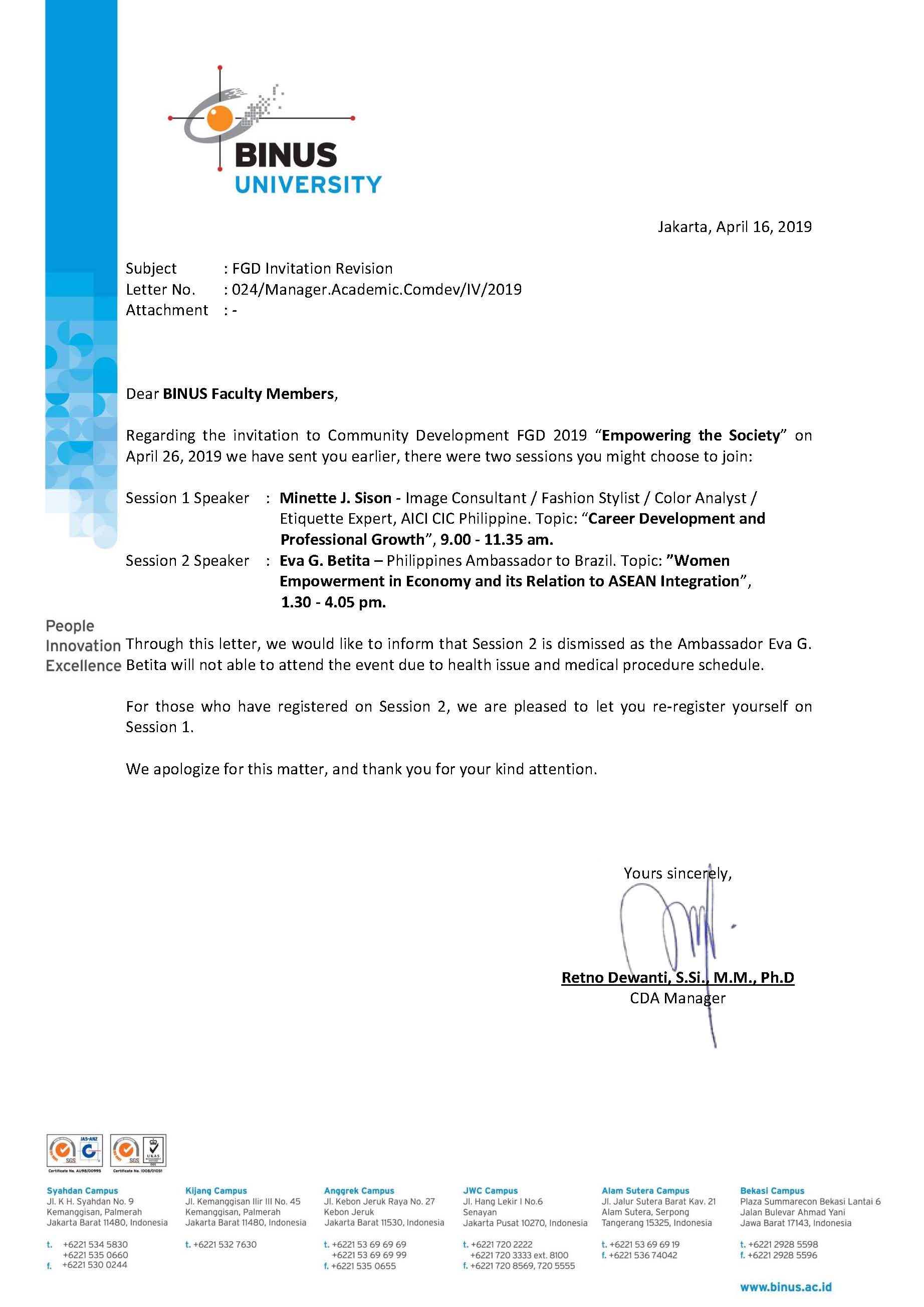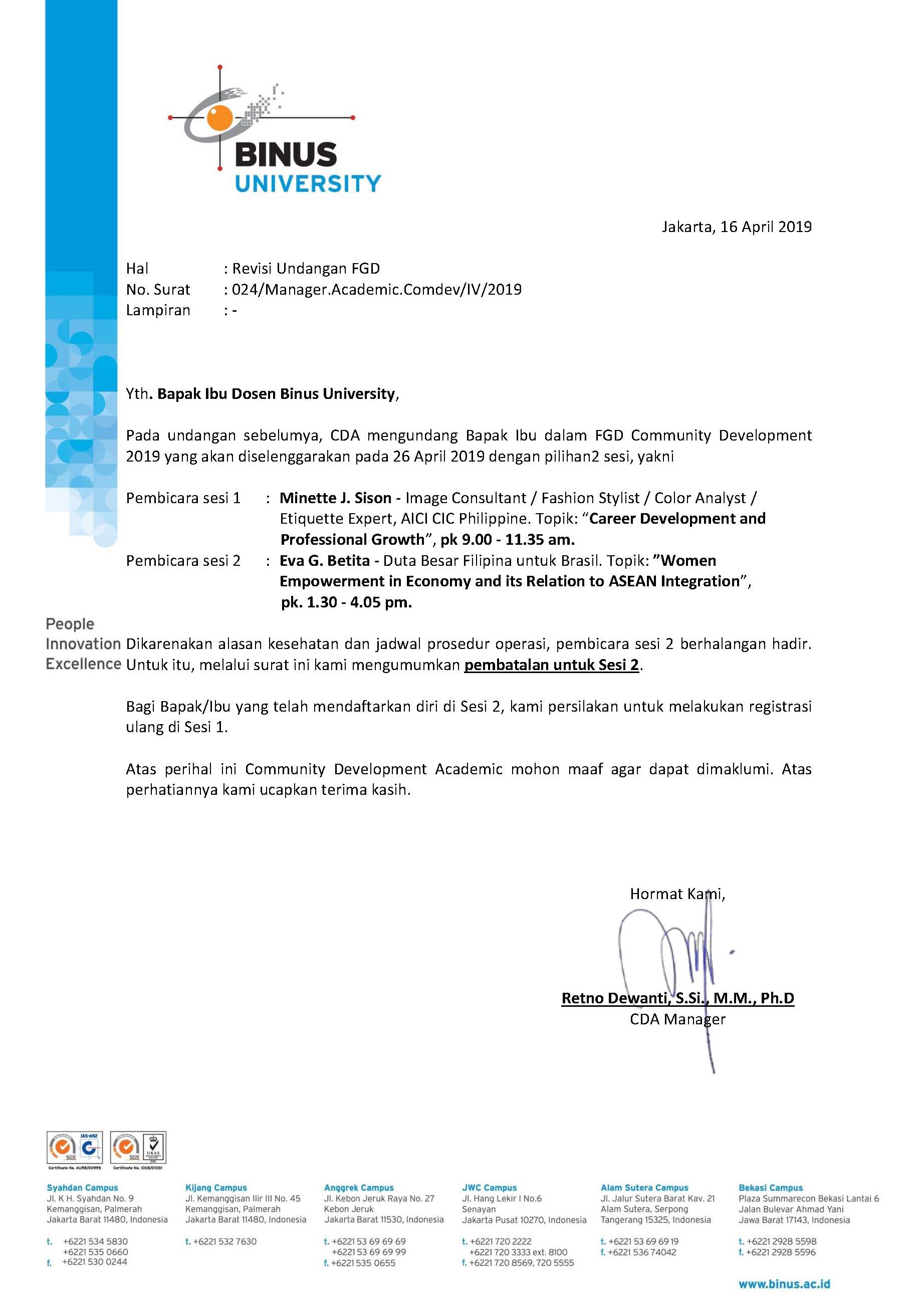 Please kindly give a confirmation by choosing one out of two sessions offered through the following form https://comdev.binus.ac.id/undangan-26-april/
