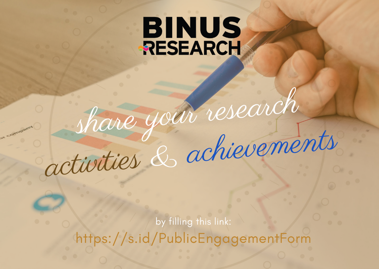 To support and appreciate your efforts, especially in the field of research, we from the Research and Technology Transfer invite you to share photos and videos of your research activities and achievements to be published in the Social Media of Binus Research, with the aim to empower other researchers to be more motivated in conducting research.