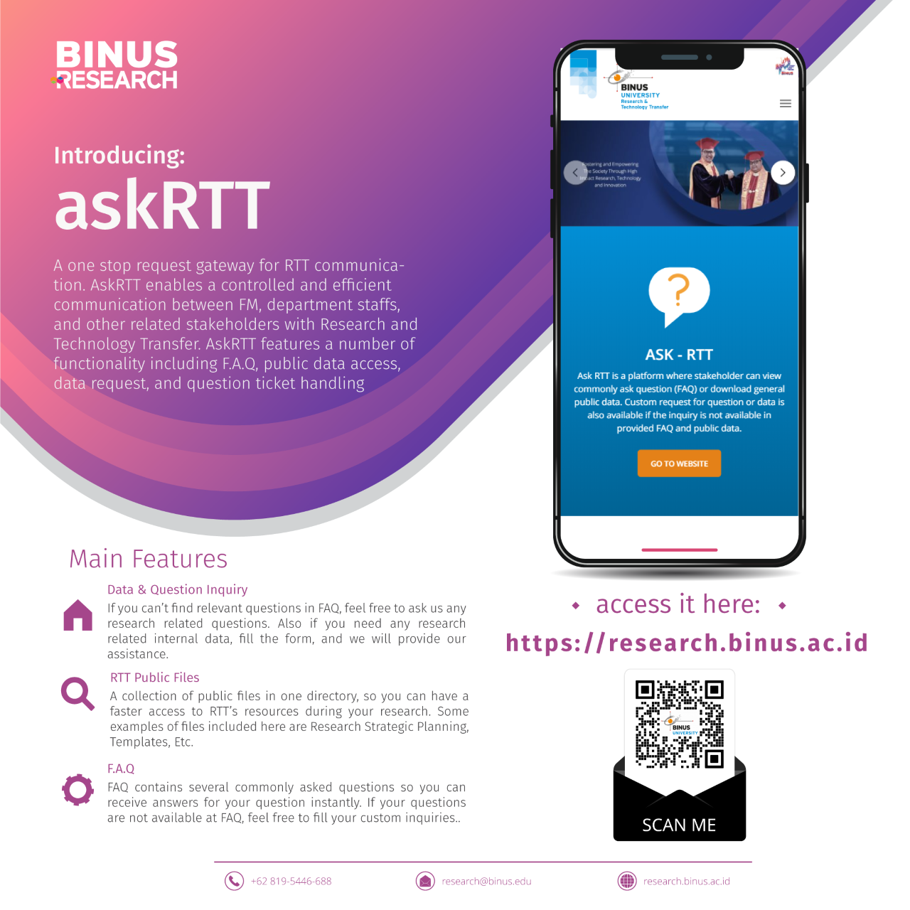 Terkait dengan upaya peningkatan kualitas pelayanan kepada seluruh stakeholder dari BINUS University khususnya BINUS Research, maka dengan ini kami ingin memperkenalkan salah satu aplikasi web terbaru dari RTT bernama AskRTT.