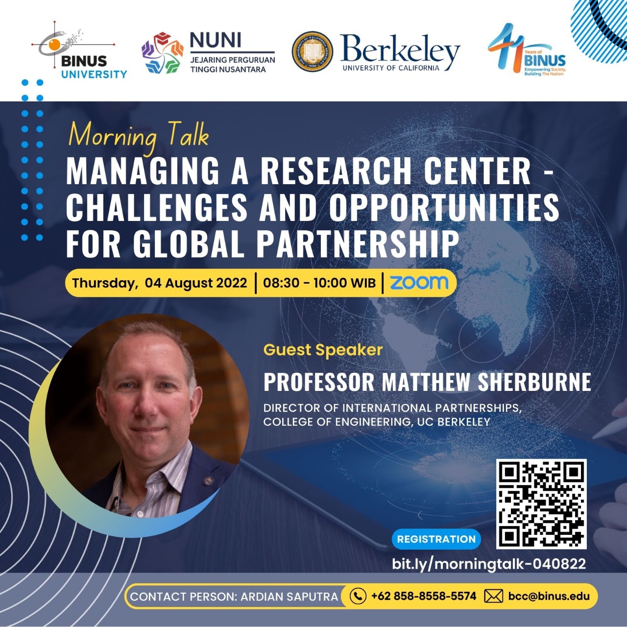BINUS University, in collaboration with Nationwide University Network in Indonesia (NUNI), proudly presents Morning Talk: Managing a Research Center - Challenges and Opportunities for Global Partnership