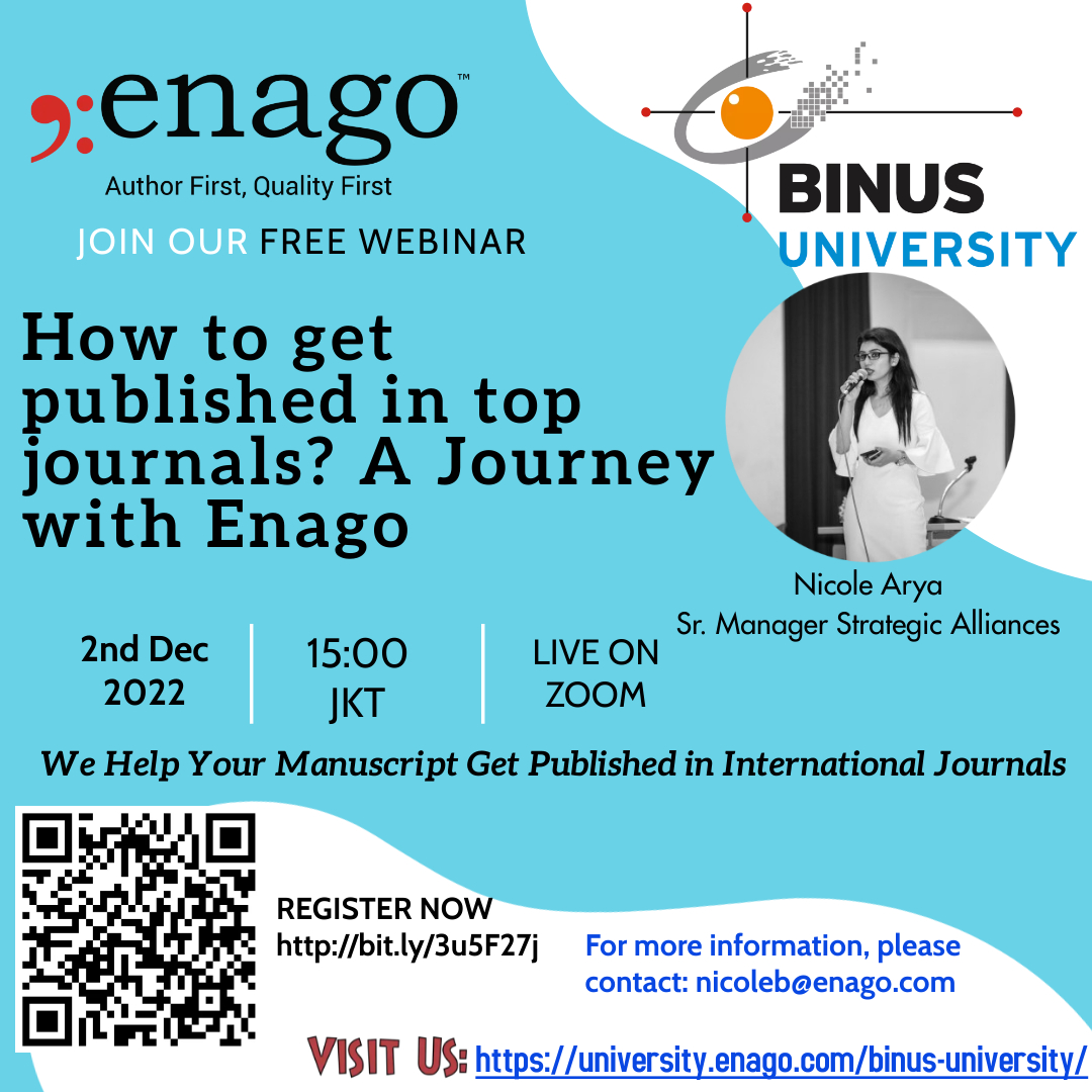 Dalam rangka membekali kompetensi penelitian Bapak/Ibu Faculty Member Bina Nusantara University, dengan ini Research and Technology Transfer Office mengundang Bapak/Ibu untuk menghadiri webinar "How to get published in top journals? A journey with Enago" yang akan dibawakan oleh Enago.