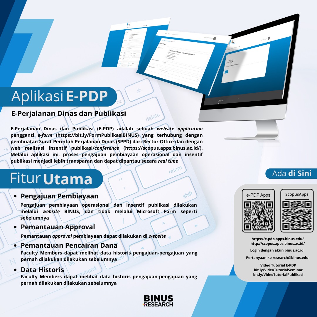 Bersama ini, kami mengundang Bapak/Ibu untuk menghadiri sesi Launching e-PDP (Research Request) dan Scopus.Apps, aplikasi yang ke depannya akan digunakan untuk melakukan pencatatan capaian publikasi, serta mengajukan pembiayaan operasional publikasi serta insentif publikasi Scopus.