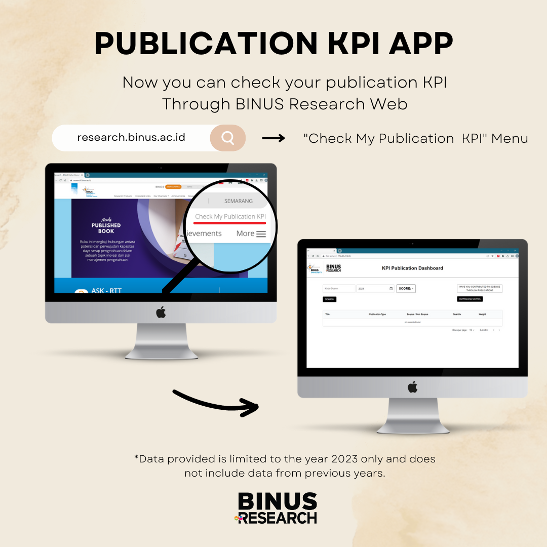 The application can be accessed through the Binus research website at https://research.binus.ac.id/ by clicking the "Check My Publication KPI" menu in the top right corner of the page. With just a few clicks, you can now monitor your publications in real-time and see how they contribute to the university's overall performance.