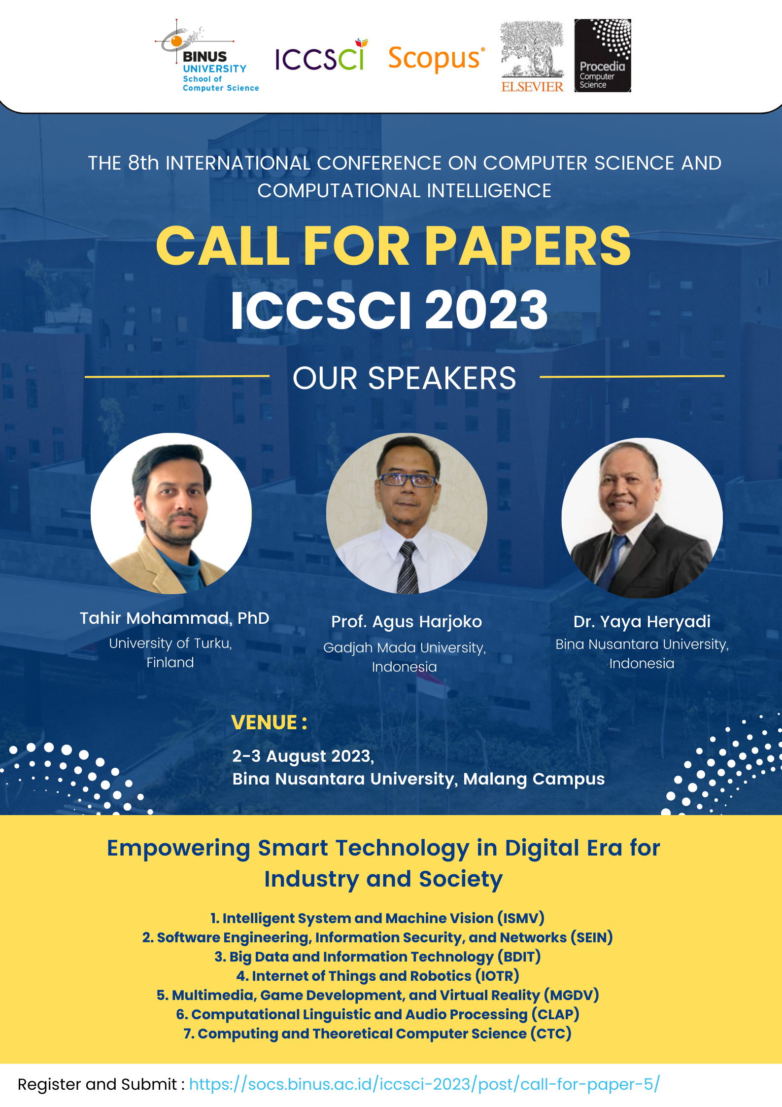 The 8th International Conference on Computer Science and Computational Intelligence (ICCSCI 2023) is an annual forum for researchers, engineers, and scientist to disseminate their knowledge and research result in Computer Science, Computational Intelligence, and Information Technology. We cordially invites you to submit your research result in the ICCSCI 2023. This year, ICCSCI 2023 is themed "Empowering Smart Technology in Digital Era for Industry and Society". By using that theme, ICCSCI 2023 accept full papers in these areas, but not limited to: