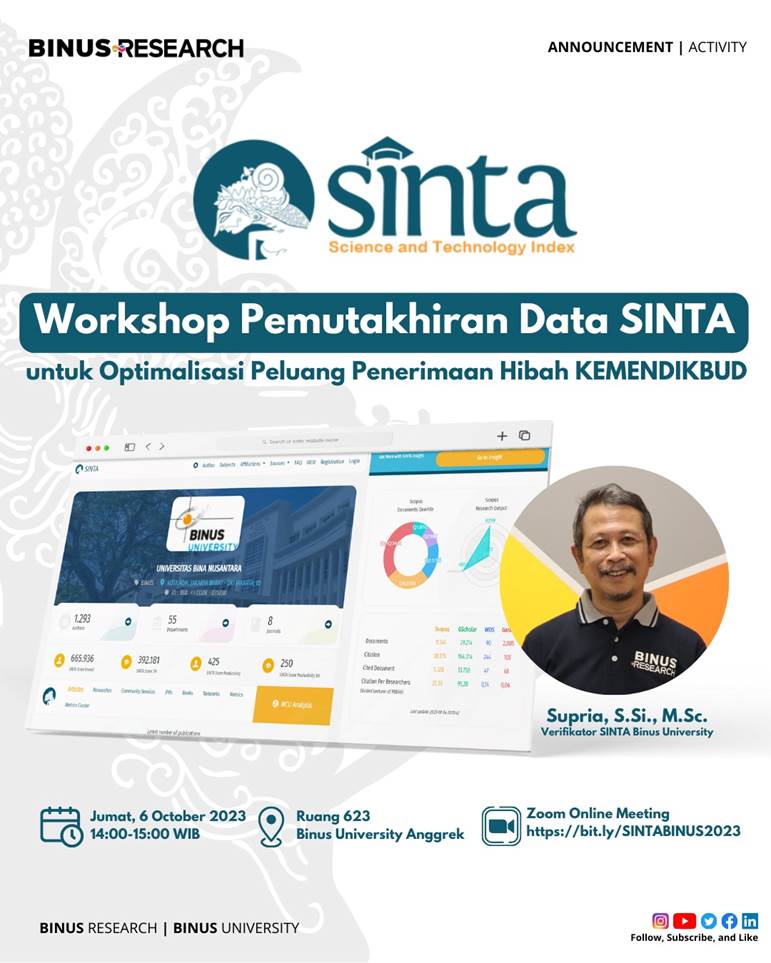 Tempat: Ruang 623, BINUS University Anggrek Campus atau Zoom Online Meeting pada link https://bit.ly/SINTABINUS2023 (Meeting ID: 992 8359 3159 Passcode: 018351)