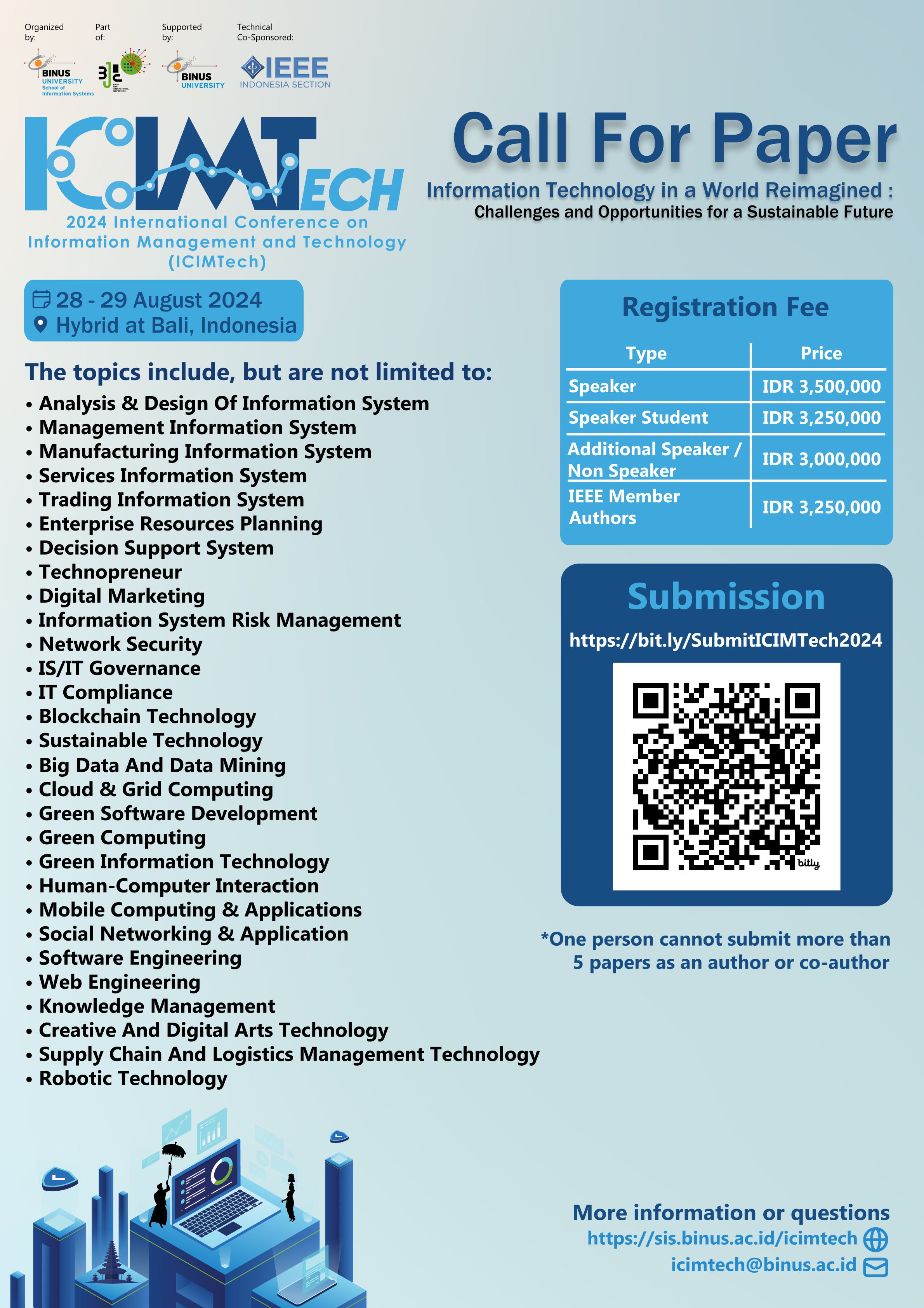 The conference aims to bring together researchers and experts in information systems to share their ideas, experiences, and insights. ICIMTech is organized by the School of Information Systems, Bina Nusantara University. ICIMTech 2024 would focus on the theme Information Tehcnology in a World Reimagined : Challenges and Opportunities for a Sustainable Future delivered through the Keynotes Speakers and Distinguished Lecturers. Papers from the previous ICIMTech have been published in IEEE Xplore and indexed by SCOPUS.
