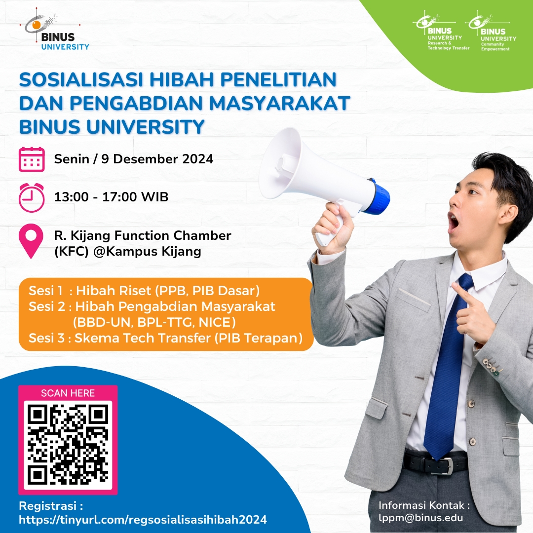 Sehubungan dengan akan dimulainya periode pengajuan usulan penelitian dan pengabdian masyarakat hibah BINUS, kami informasikan bahwa Research & Technology Transfer Universitas Bina Nusantara akan mengadakan "sosialisasi skema pendanaan hibah Penelitian dan Pengabdian Kepada Masyarakat BINUS" yang akan dilaksanakan pada: