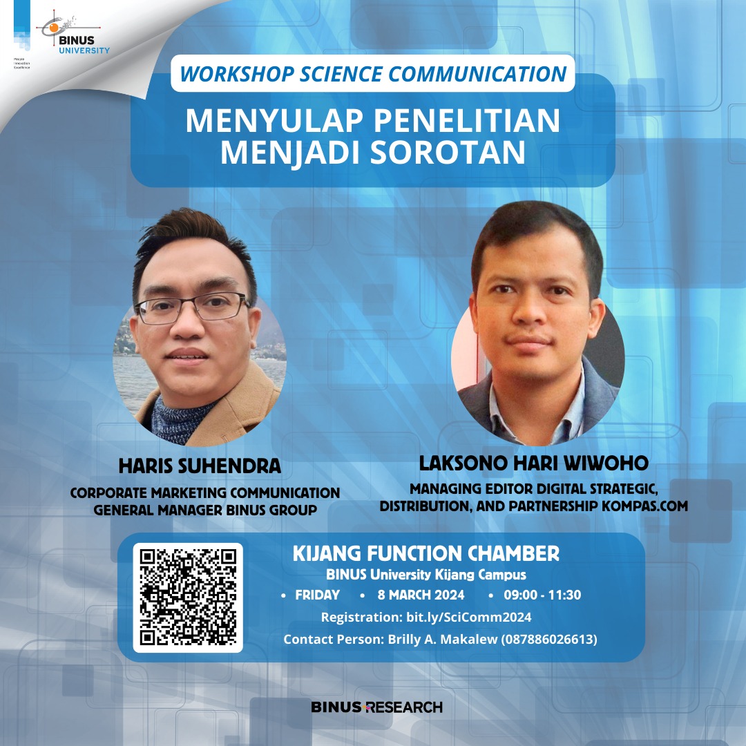Dalam rangka memaksimalkan pemanfaatan penelitian dan memudahkan publik dalam memahami serta menggunakan hasil-hasil penelitian FM di BINUS University, Research and Technology Transfer mengundang Bapak/Ibu dalam Workshop Onsite dengan judul "Workshop Science Communication: Menyulap Penelitian Menjadi Sorotan". Workshop ini bertujuan untuk memberikan wawasan dan alat yang diperlukan bagi para peneliti dan akademisi untuk mempublikasikan hasil penelitian mereka ke dalam bentuk yang lebih populer dan mudah diakses oleh masyarakat luas.