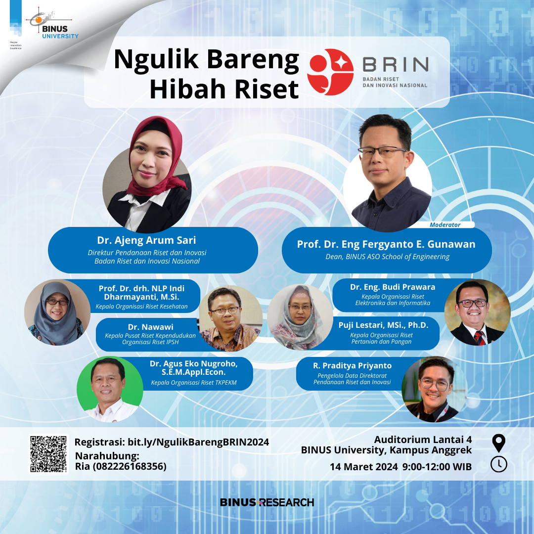 Bersama email berikut ini, kami mengundang Prof/Bapak/Ibu untuk berkenan hadir pada acara "Ngulik Bareng Hibah Riset BRIN" yang akan dihadiri oleh Dr Ajeng Arum Sari, Direktur Pendanaan Riset dan Inovasi BRIN Bersama dengan para Kepala Organisasi Riset BRIN dan dimoderatori oleh Prof. Fergyanto E. Gunawan, Dr. Eng, Dean of BINUS ASO School of Engineering. Acara ini akan diselenggarakan pada: