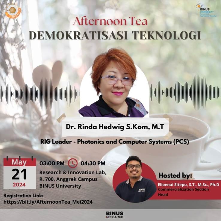 Acara ini akan menghadirkan pembicara Ibu Dr. Rinda Hedwig S.Kom, M.T (RIG Leader – Photonics and Computer Systems) yang akan membahas topik yang menarik, yaitu “Demokratisasi Teknologi”. Dr. Rinda akan berbagi bagaimana melakukan penelitian multi disiplin dan berfokus pada solusi serta menciptakan teknologi sederhana yang bisa membantu masyarakat.