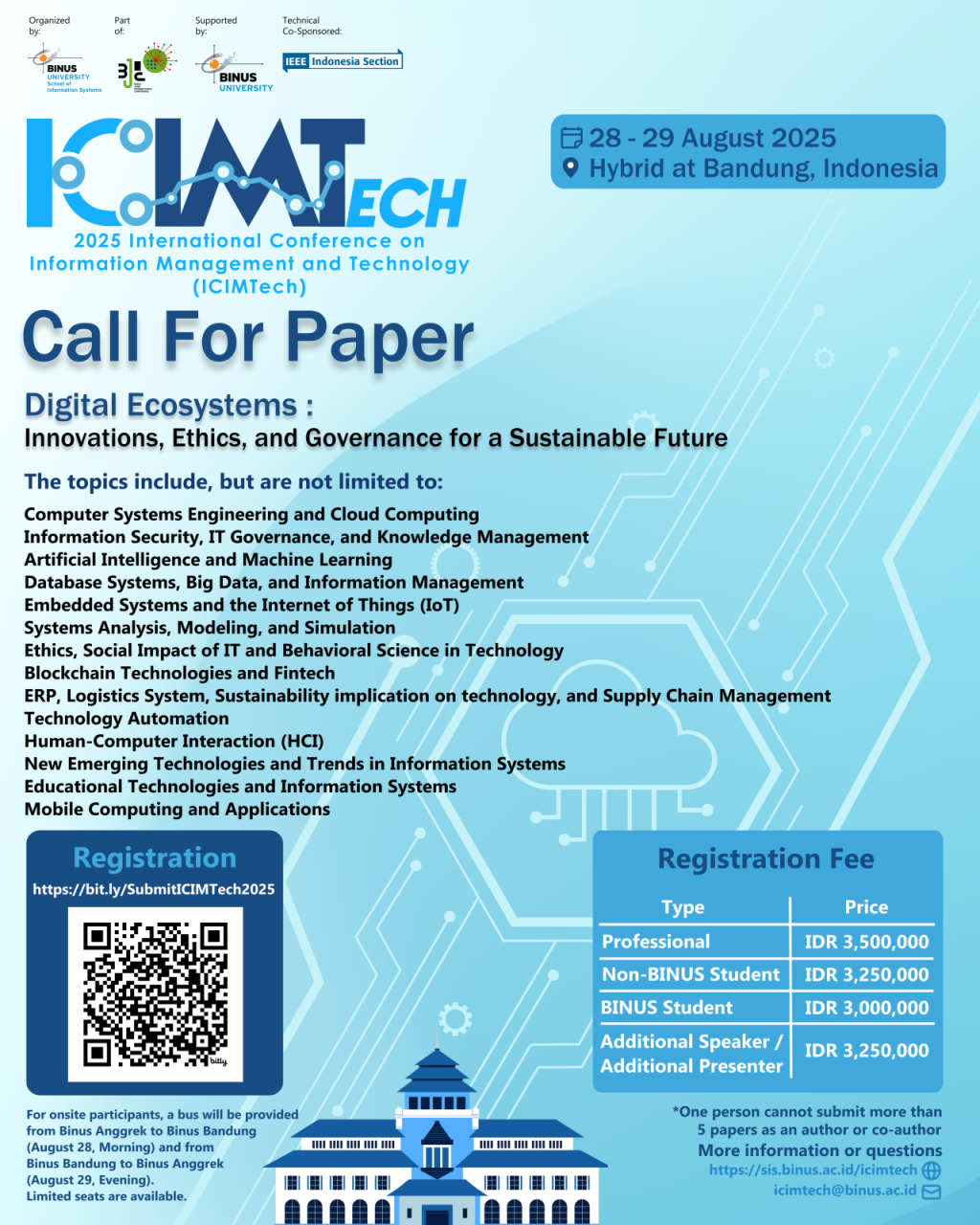 For onsite participants, a bus will be provided from BINUS Anggrek Campus to BINUS Bandung Campus (August 28th, Morning) and from BINUS Bandung Campus to Binus Anggrek Campus (August 29th, Evening). Limited seats are available.