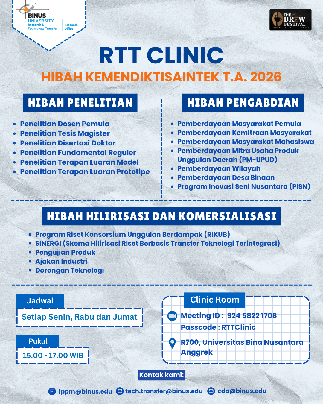 Dalam rangka mendukung persiapan dan kualitas proposal Prof/Bapak/Ibu, Research and Technology Transfer (RTT) menyelenggarakan RTT Clinic.
