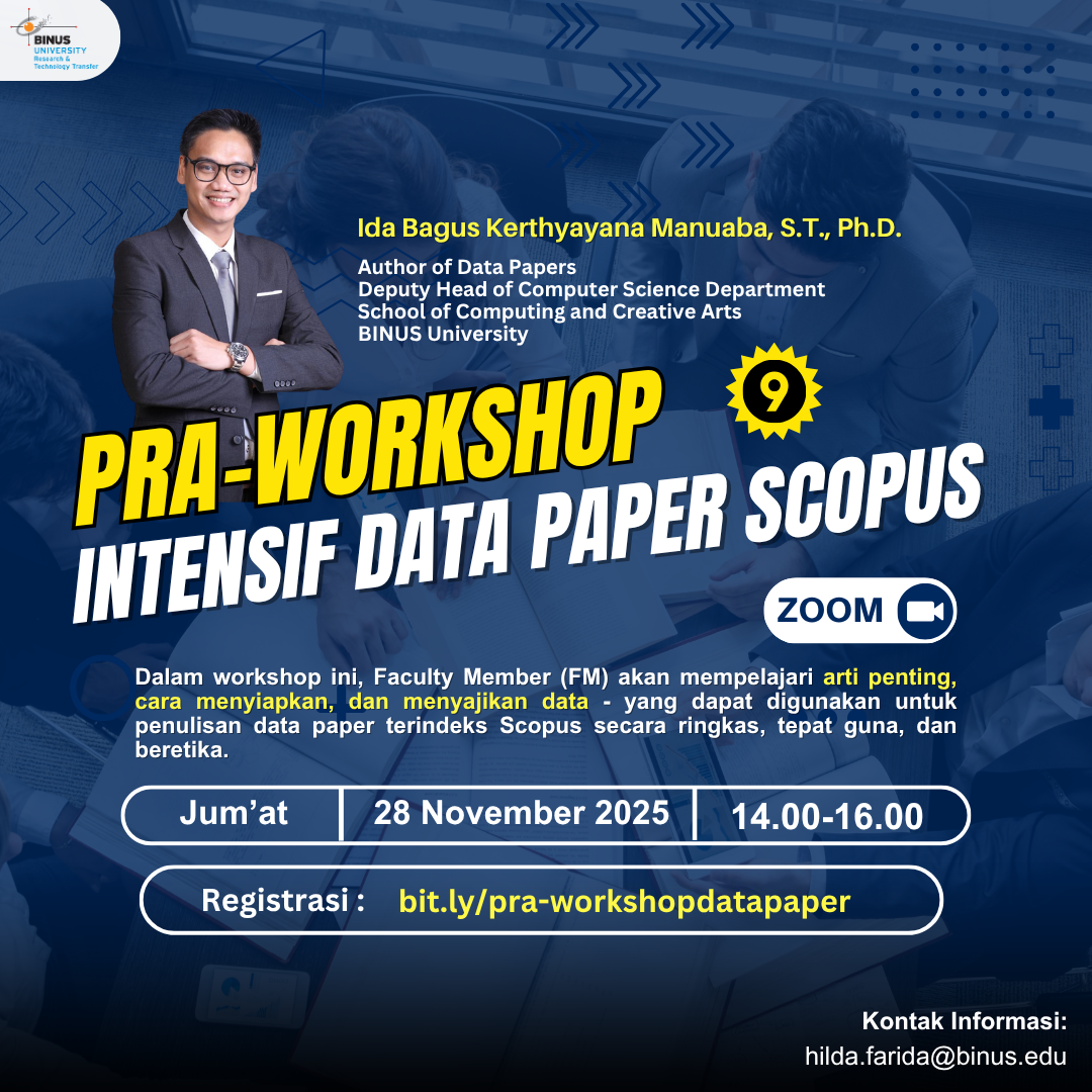 Dalam rangka membekali kompetensi penelitian bagi para dosen BINUS University, Research & Technology Transfer (RTT) mengundang Bapak/Ibu untuk turut serta berpartisipasi pada pelatihan “Pra-Workshop Intensif Data Paper Scopus Batch 9” yang akan diadakan pada: