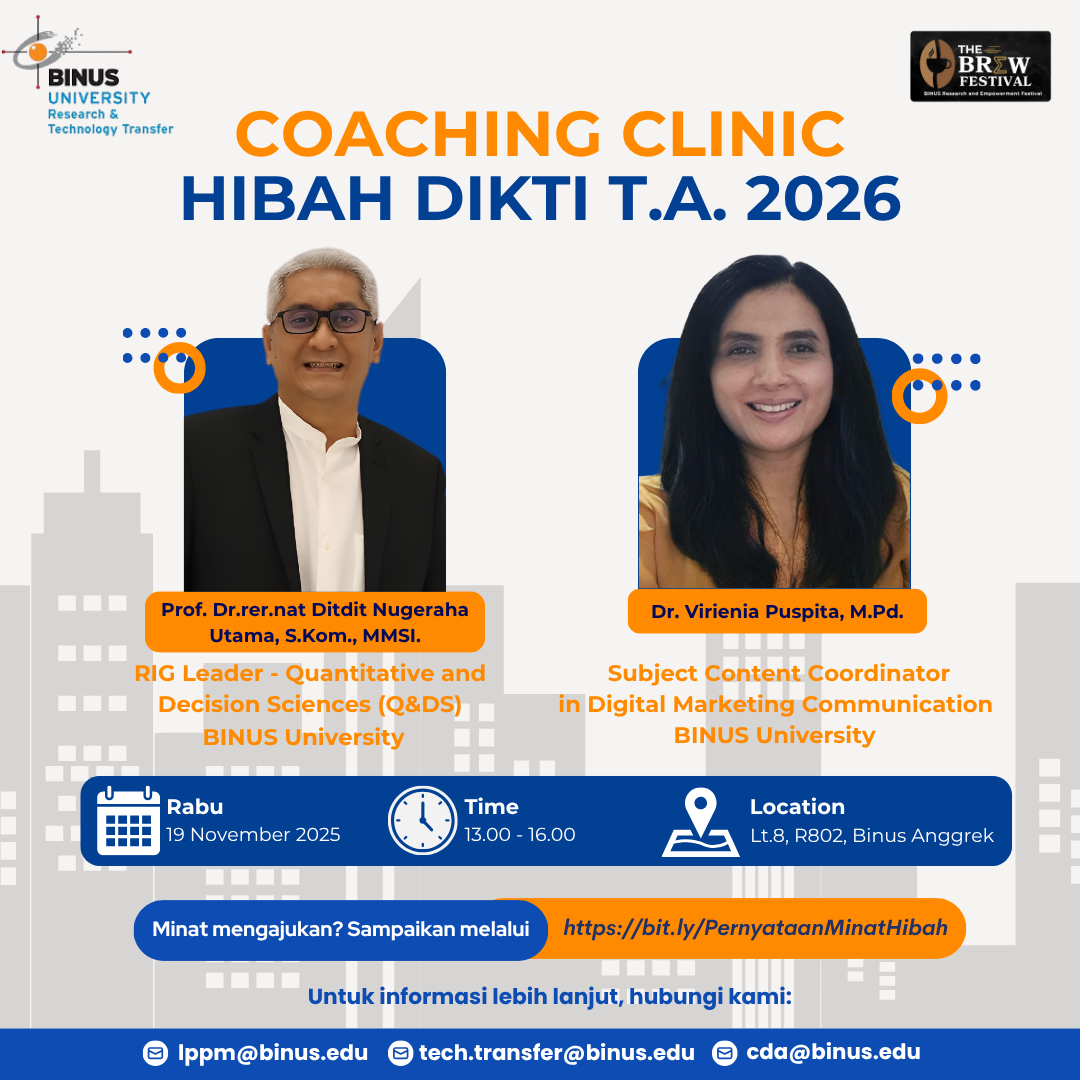 BINUS University melalui Research & Technology Transfer mengundang Prof/Bapak/Ibu untuk hadir dalam mempersiapkan Proposal Hibah Dikti T.A. 2026 :