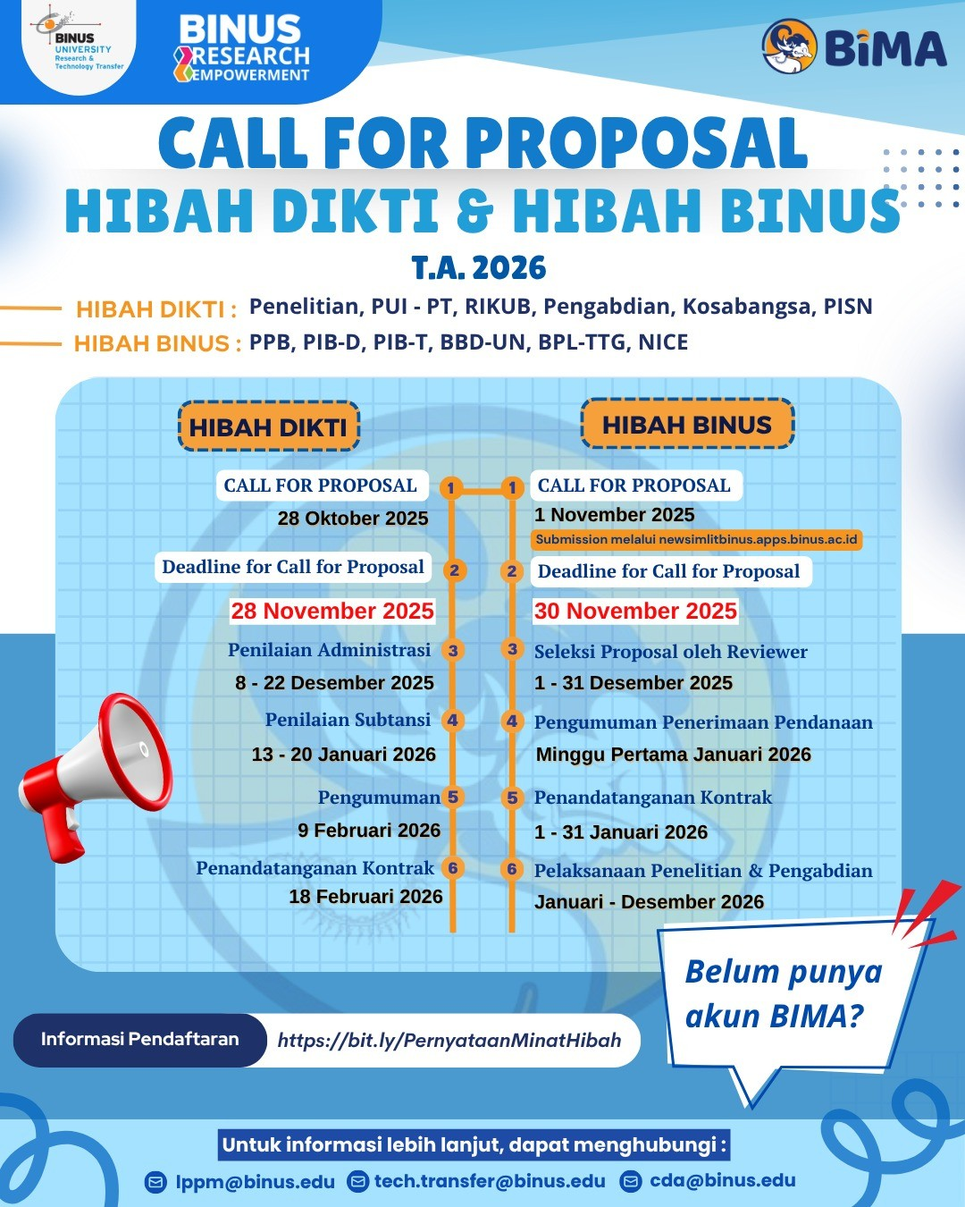 Saat ini Call for Proposal Hibah KEMENDIKTISAINTEK (Batch 1) dan Hibah BINUS T.A. 2026 telah dibuka dengan batas akhir pengumpulan proposal Hibah KEMENDIKTISAINTEK pada 28 November 2025 dan Hibah BINUS pada 30 November 2025.