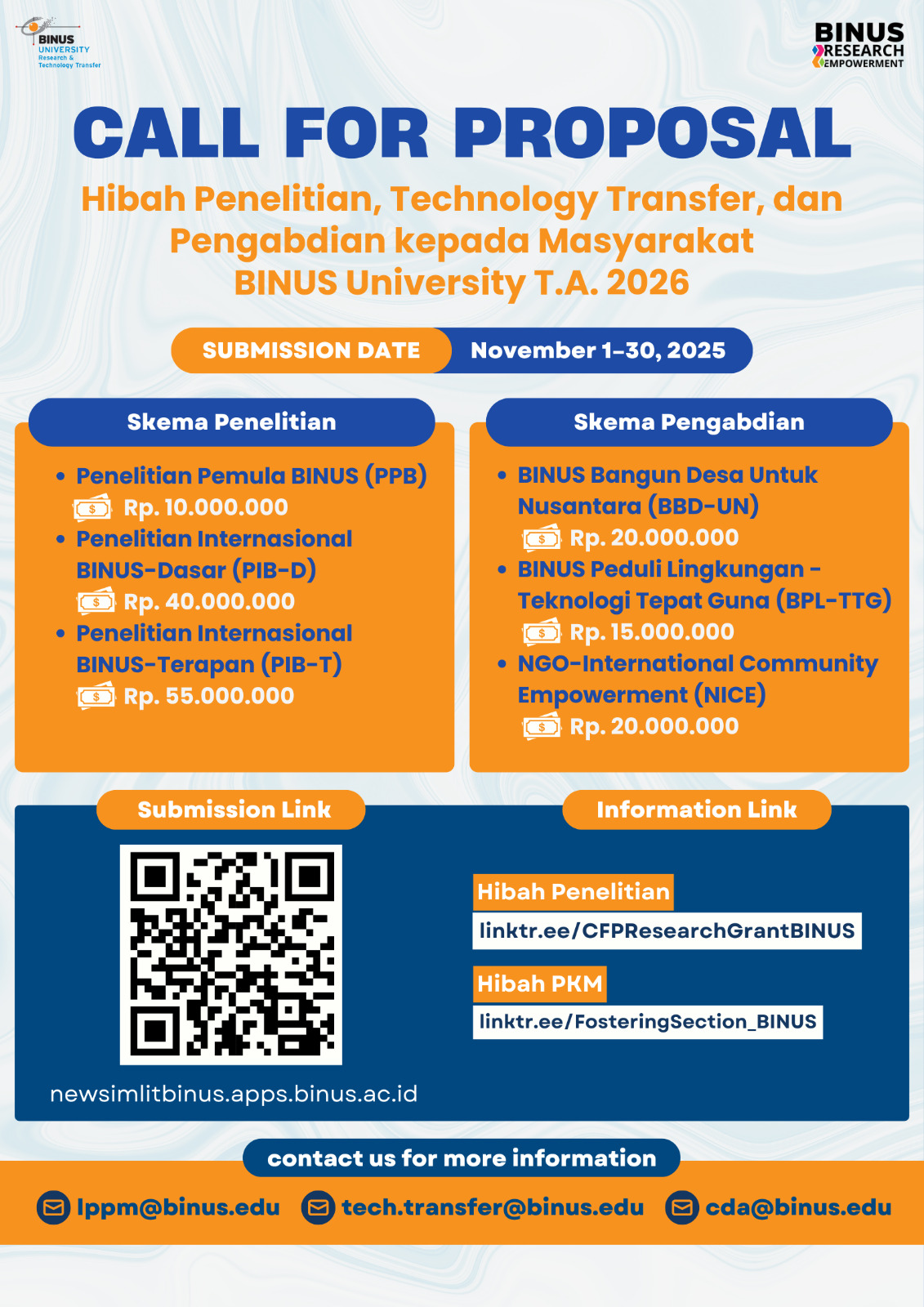 Dengan ini kami menginformasikan bahwa pendaftaran Call for Proposal (CFP) Hibah Penelitian dan Pengabdian kepada Masyarakat (PkM) BINUS University T.A. 2026 secara resmi telah DIBUKA.
