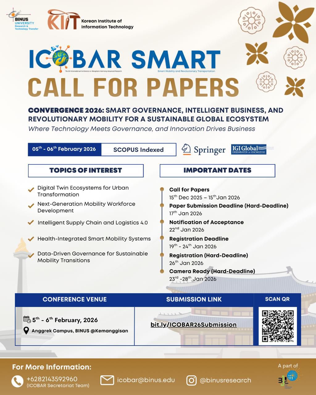 Kami mengundang Prof dan Bapak/Ibu untuk mengirim naskah/paper dan berpartisipasi dalam The 8th International Conference on Biospheric Harmony Advanced Research (ICOBAR–SMART 2026), konferensi internasional yang diselenggarakan melalui kolaborasi antara BINUS University dan Korean Institute of Information Technology (KIIT), asosiasi akademik terkemuka di Korea Selatan di bidang teknologi informasi, bersamaan dengan konferensi internasional KIIT yaitu SMART (Smart Mobility and Revolutionary Transportation).