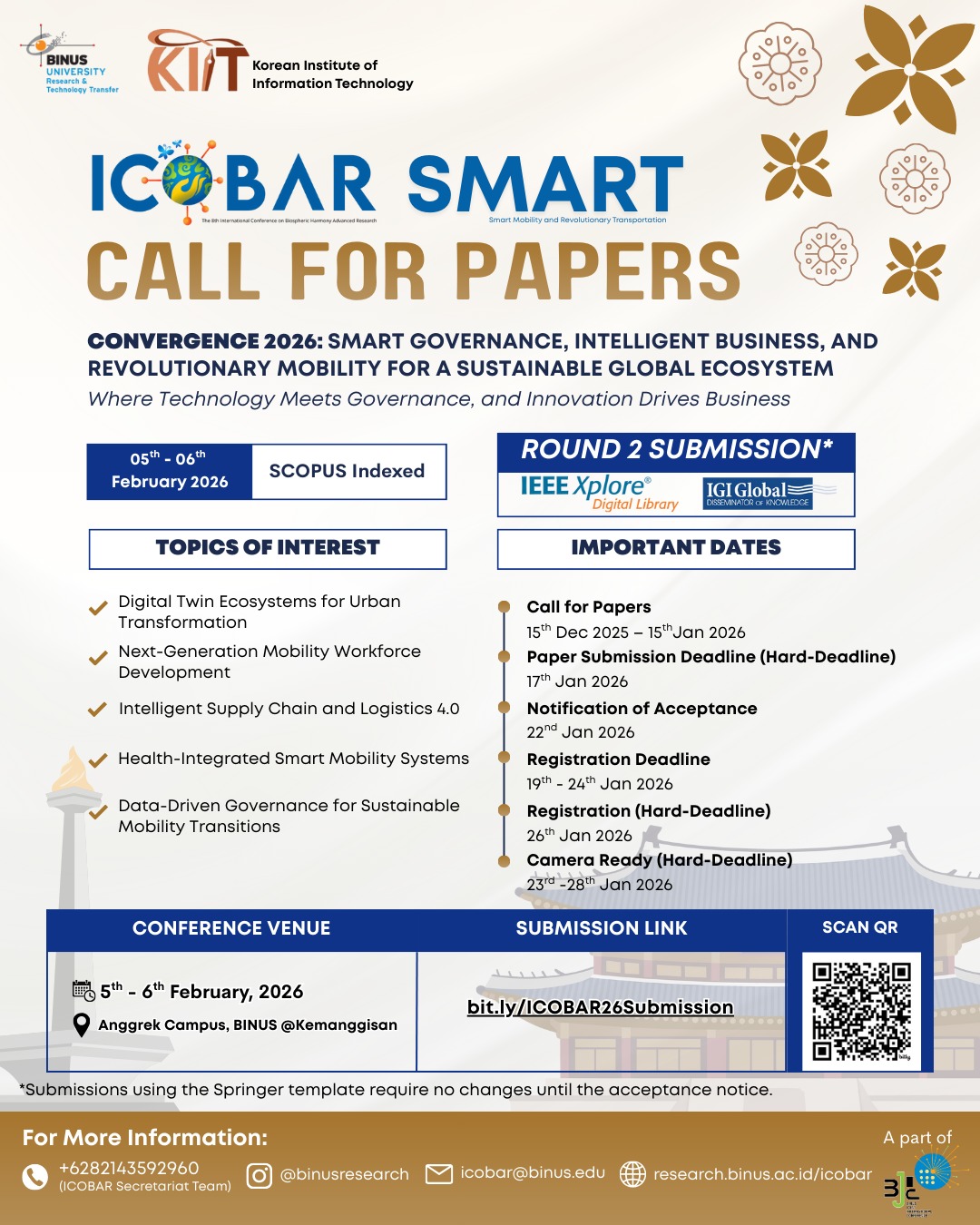 Sehubungan dengan hal tersebut, kami mengundang Prof dan Bapak/Ibu untuk mengirimkan naskah/paper dan berpartisipasi dalam The 8th International Conference on Biospheric Harmony Advanced Research (ICOBAR–SMART 2026), sebuah konferensi internasional hasil kolaborasi antara BINUS University dan Korean Institute of Information Technology (KIIT), asosiasi akademik terkemuka di Korea Selatan di bidang teknologi informasi, yang diselenggarakan bersamaan dengan konferensi internasional KIIT, SMART (Smart Mobility and Revolutionary Transportation).