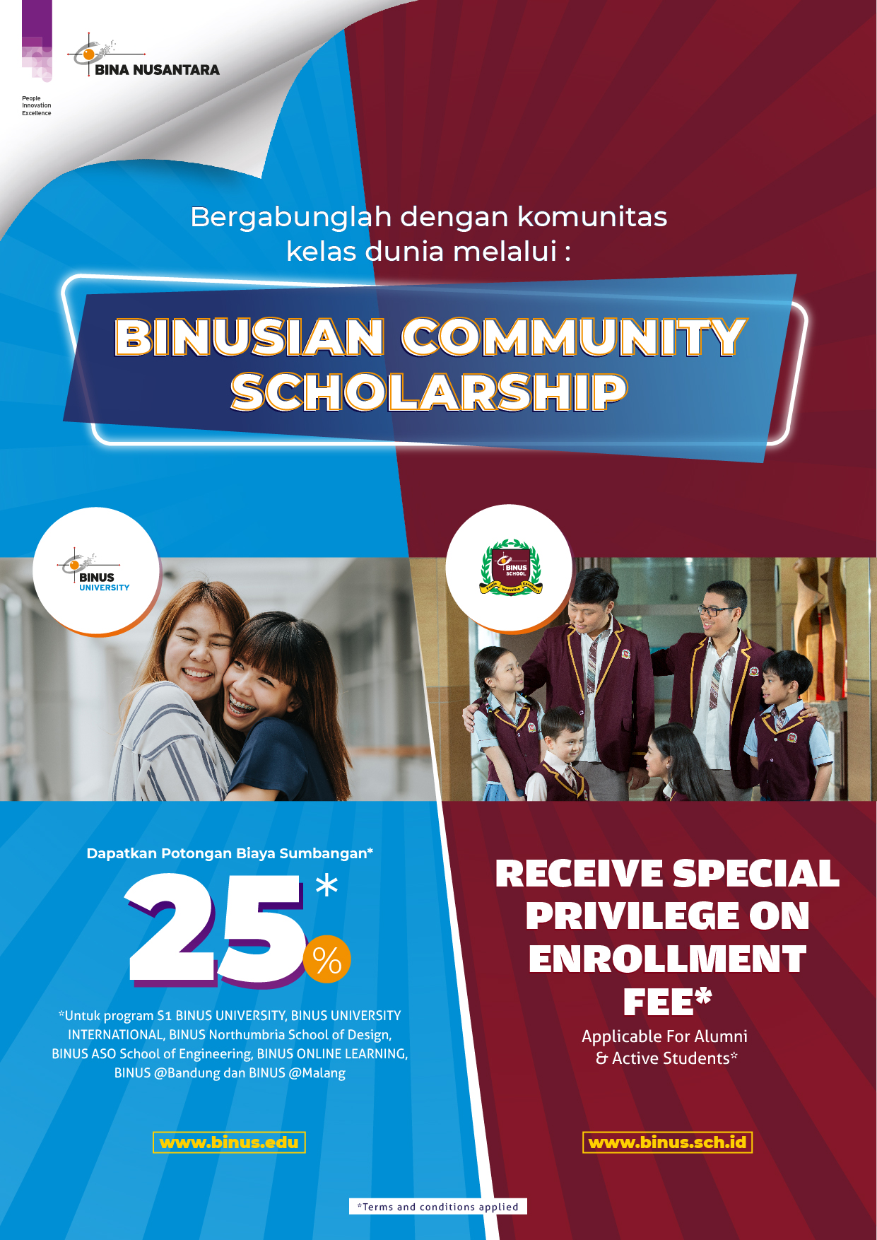 BINA NUSANTARA mempersembahkan BINUSIAN Community Scholarship - Apresiasi untuk Keluarga BINUSIAN berupa loyalty program beasiswa BINUS UNIVERSITY dan BINUS SCHOOL.