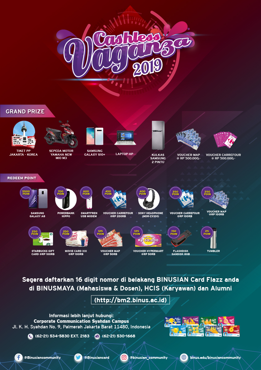Zaman now bawa duit kemana-mana? Lebih baik cashless saja pakai BINUSIAN Card Flazz kamu. Sekarang cashless pakai BINUSIAN Card Flazz bisa lebih mantul loh karena ada program Cashless Vaganza. Tinggal kumpulin poinnya dan nikmati berbagai hadiahnya. Kamu juga bisa dapat kesempatan untuk memenangkan hadiah grand prize yang menarik yang akan diundi di akhir periode.
