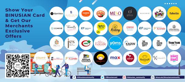 Datang ke merchant terus dapat diskon atau harga khusus BINUSIAN? Bisa banget. Ada BINUSIAN Merchant Program yang berlaku untuk semua BINUSIAN mulai dari mahasiswa aktif (S1-S3), siswa School di Serpong Bekasi Simprug, karyawan BINUS, member RISE hingga Alumni.