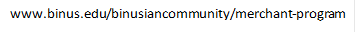 Apa sih Binusian Merchant Program? Binusian Merchant Program adalah kerja sama antara BINA NUSANTARA dengan mitra BINUSIAN Card Flazz yang bertujuan untuk memberikan keuntungan tambahan kepada para BINUSIAN dalam bentuk pemberian Discount atau Special price saat melakukan transaksi dengan cara menunjukkan BINUSIAN Card ke outlet yang bekerjasama.