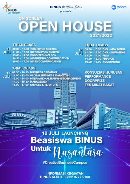 Untuk itu kami mengundang kalian semua untuk hadir di acara OPEN HOUSE on SCREEN BINUS @Alam Sutera! Dengan menghadirkan sesi Trial Class SELURUH JURUSAN yang terdapat di kampus BINUS @Alam Sutera , akan ada Tes Minat Bakat, Hiburan dari UKM BINUS UNIVERSITY dan Hadiah-hadiah menarik yang akan dikirim langsung kerumah kamu!