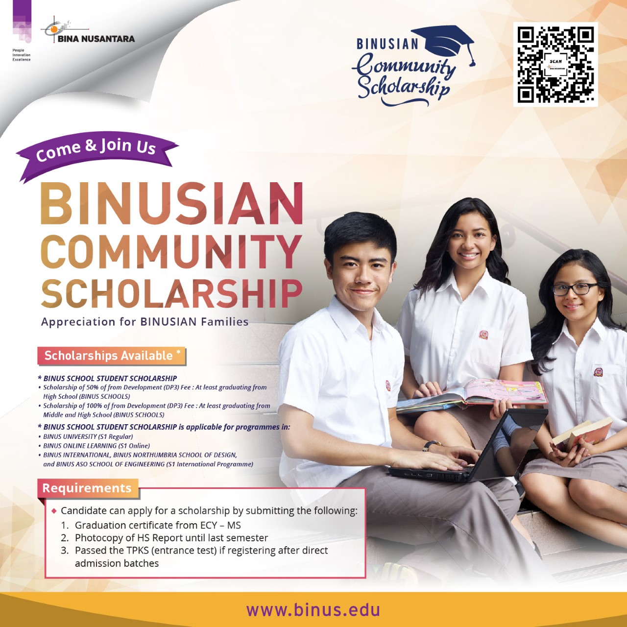 Scholarship of 100% off from Development (DP3) fee (at least graduating from middle and high school (BINUS Schools)