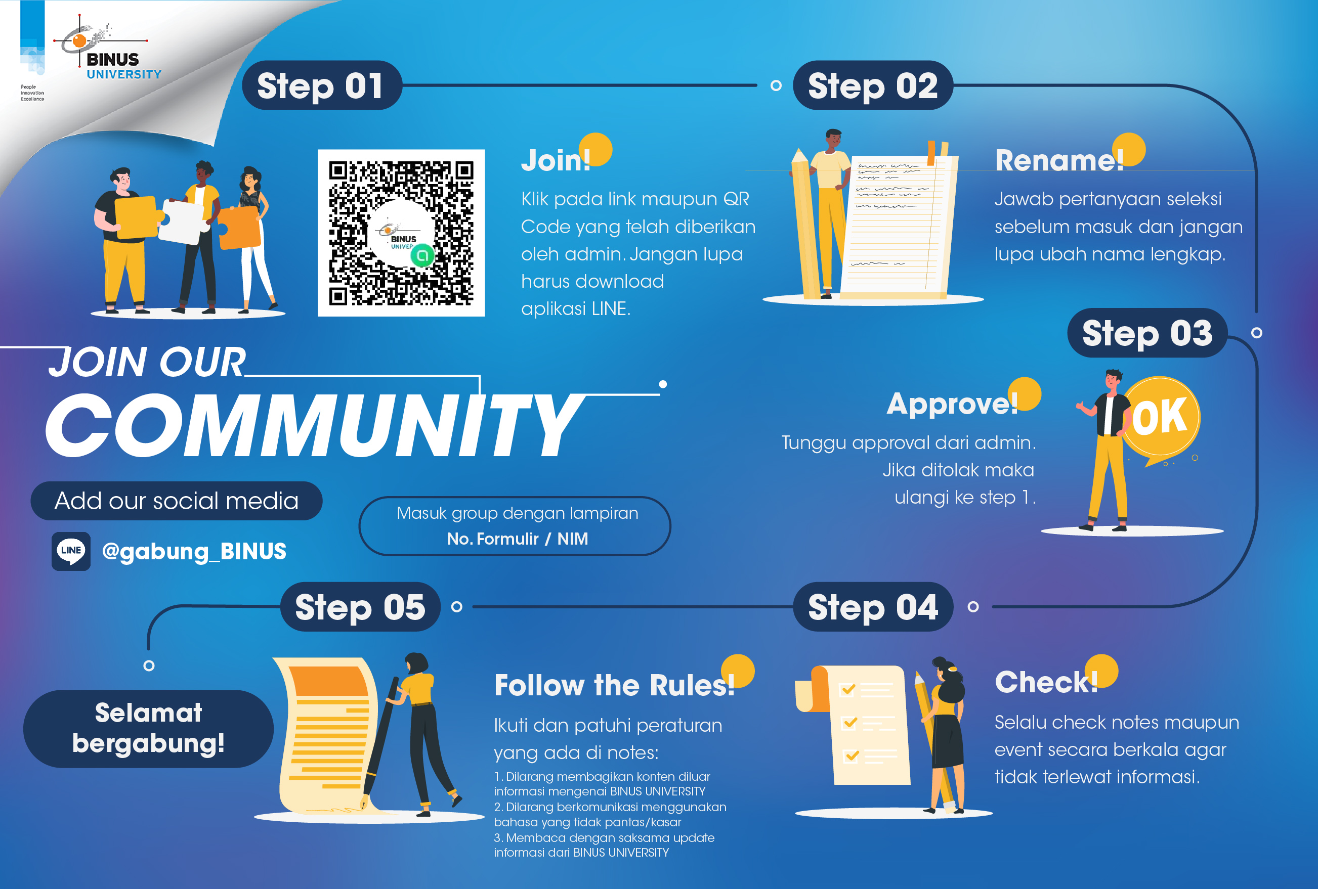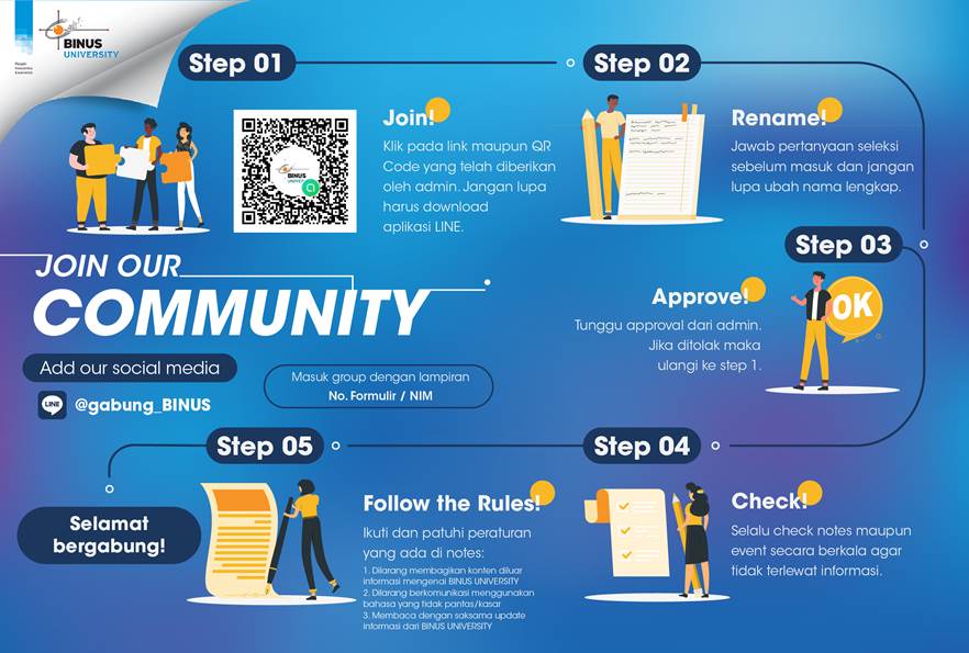 Kamu hanya perlu add LINE @Gabung_BINUS lalu klik banner dibawah, pilih "Join Our Communiity" dan masuk grup dengan lampirkan No.Formulir / NIM kamu yaa :) atau kamu bisa klik gambar diatas yah