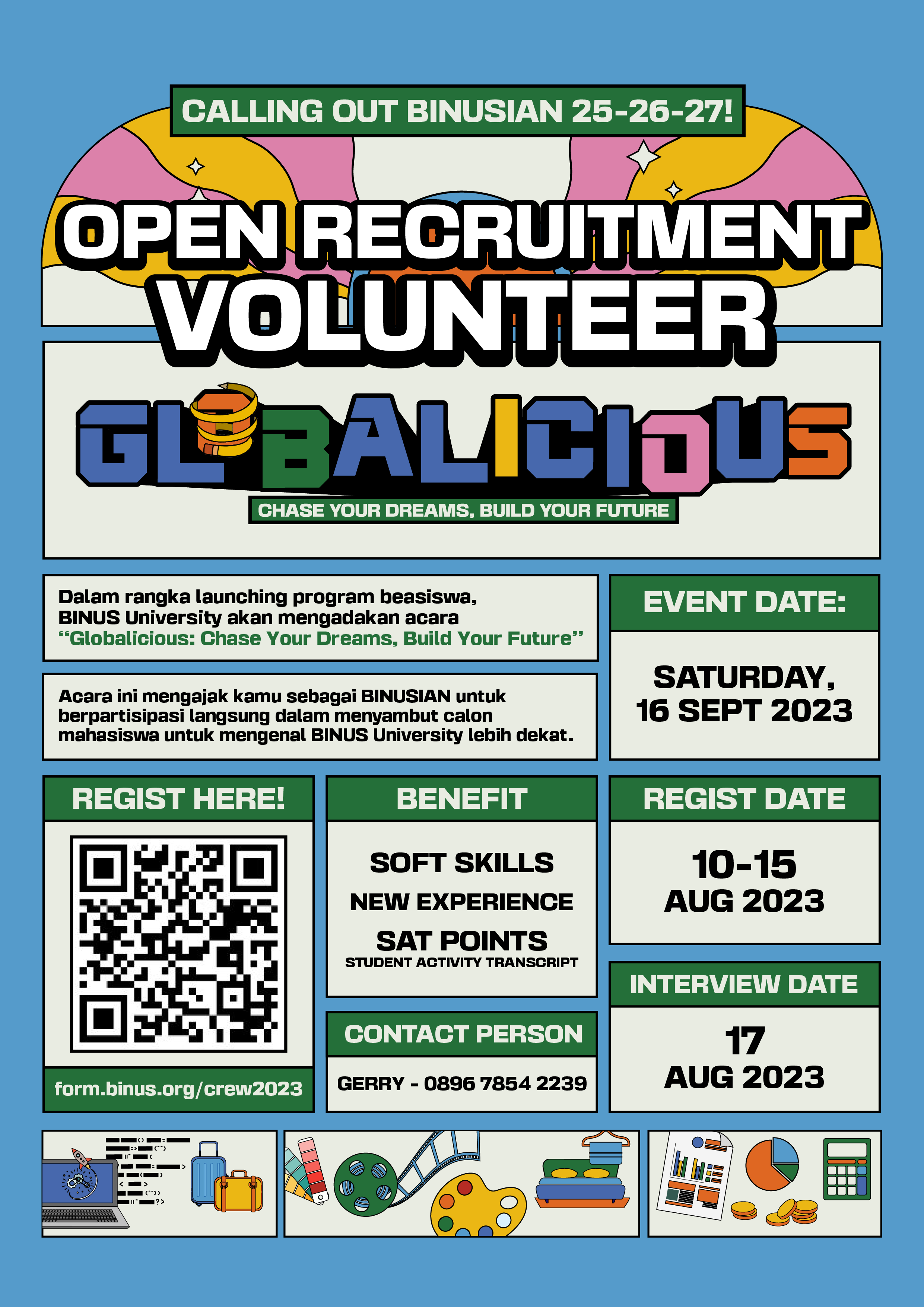 Daftarkan diri kamu dengan Banyak Benefit yang akan di dapatkan. Registrasi di https://form.binus.org/crew2023/