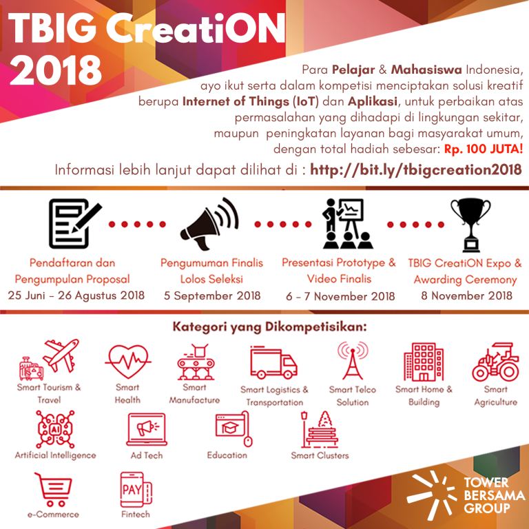 Nah, buat kamu yang ingin karyanya juga bisa diapresiasi seperti mereka, ayo segera Daftar serta kirimkan Proposalmu selambatnya pada tanggal 26 Agustus 2018! Dan ambil bagian dalam menciptakan Solusi Kreatif bagi masyarakat Indonesia, di ajang TBIG CreatiON 2018!