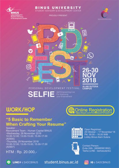 Gimana cara registrasinya? Gampang, kalian datang aja langsung ke Lobby BINUS Alam Sutera pada pukul 09.00 – 16.00 WIB, ada meja pendaftaran untuk acara PDFest ini! Ingat ya pendaftaran dibuka sampai 17 November ini, jangan sampai ketinggalan!