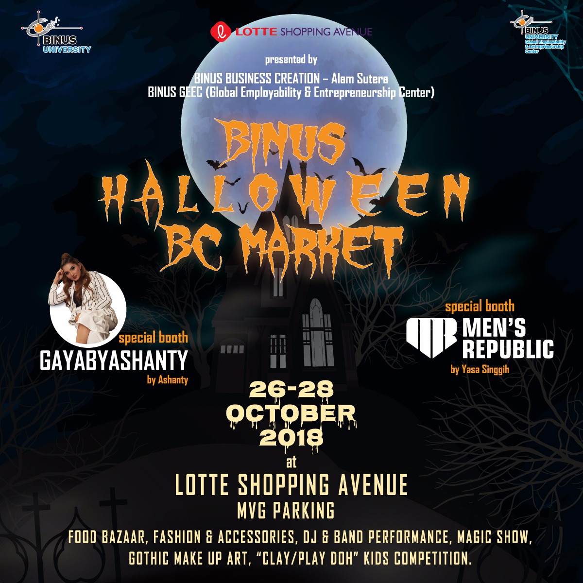 Nah buat kalian yang ingin menambah ilmu dan wawasan bisa tuh ikut seminar dari BINUS Incubator atau UKM B-Preneur, setelah itu dateng deh ke BINUS Halloween BC Market di Lotte Shopping Avenue! Bisa refreshing menikmati weekend sambal menyantap makanan yang nikmat dari food bazaar atau shopping cantik gitu. So, jangan kelewatan yah guys, sampai jumpa disana BINUSIAN!