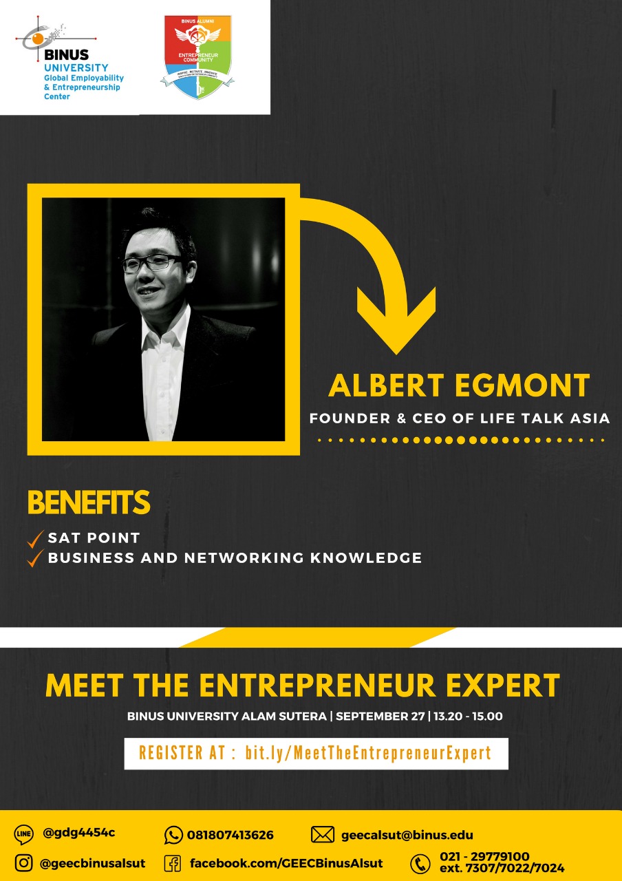 Yes! Bulan ini GEEC kembali mengadakan Meet The Entrepreneur Expert yang akan dibawakan oleh para pengusaha2 muda yang berpengalaman dalam membangun bisnis (Alumni Binus & Luar Binus)