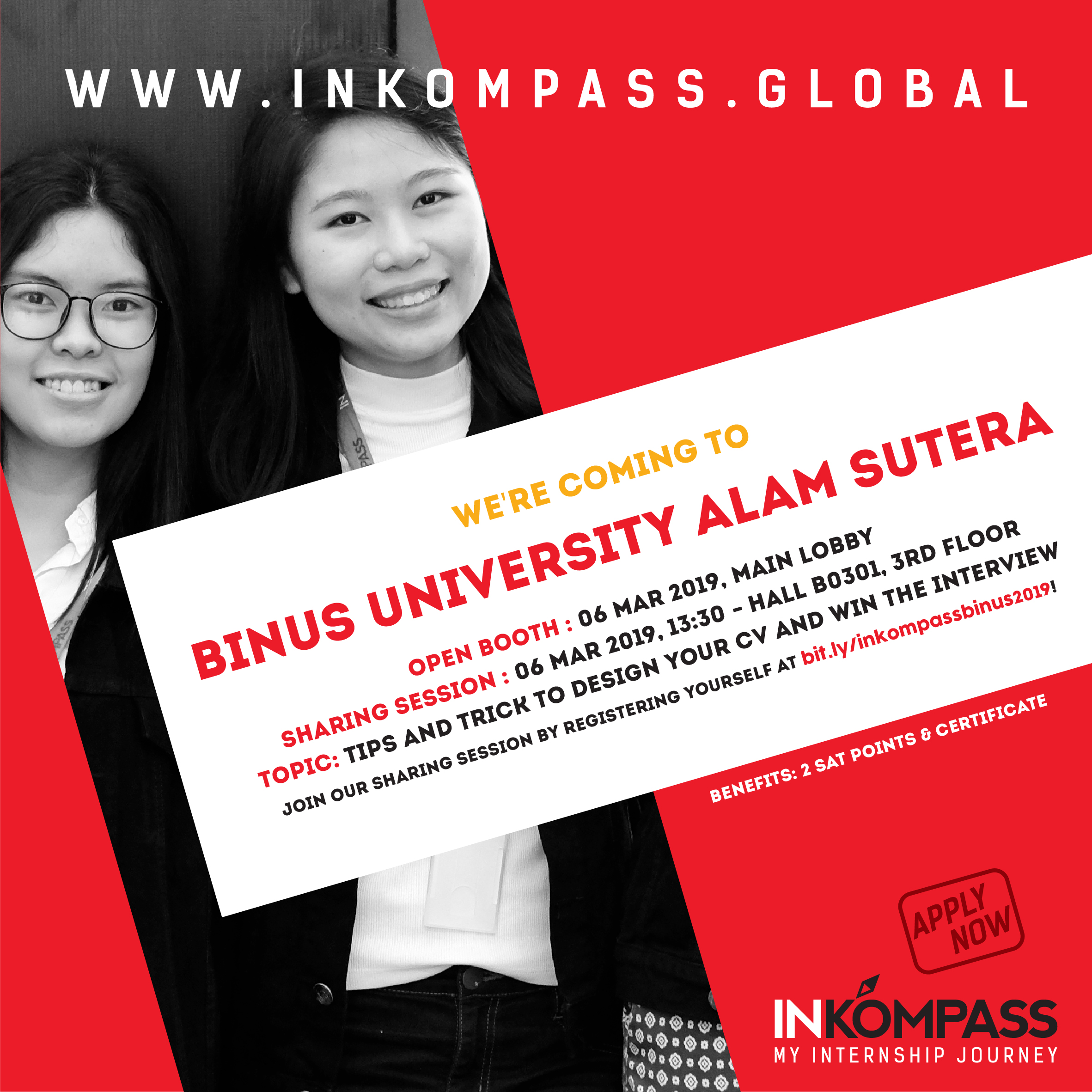 GEEC BINUS Alam Sutera bekerjasama dengan PT HM Sampoerna, Tbk kembali mengadakan acara seminar karir dan pendaftaran magang selama liburan Juni s/d Agustus 2019 bagi para Binusian Semester 4 dan 6, namun bagi Binusian Semester 2 dan 8 bisa tetap mendaftar seminar namun tidak bisa mendaftar untuk magang liburan.