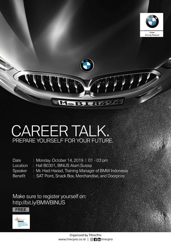Seminar akan dibawakan langsung oleh Bapak Hadi Hadad, Training Manager BMW Indonesia, kamu bisa mengenal lebih jauh seluk beluk tentang budaya kerja di BMW. Yakin ga mau ikut? Benefitnya banyak lohhh, selain seminar gratis, kamu bakal dapetin SAT, Snack Box, Merchandise BMW & Doorprize BMW. Yuk langsung daftar!! Salam BINUSIAN❤