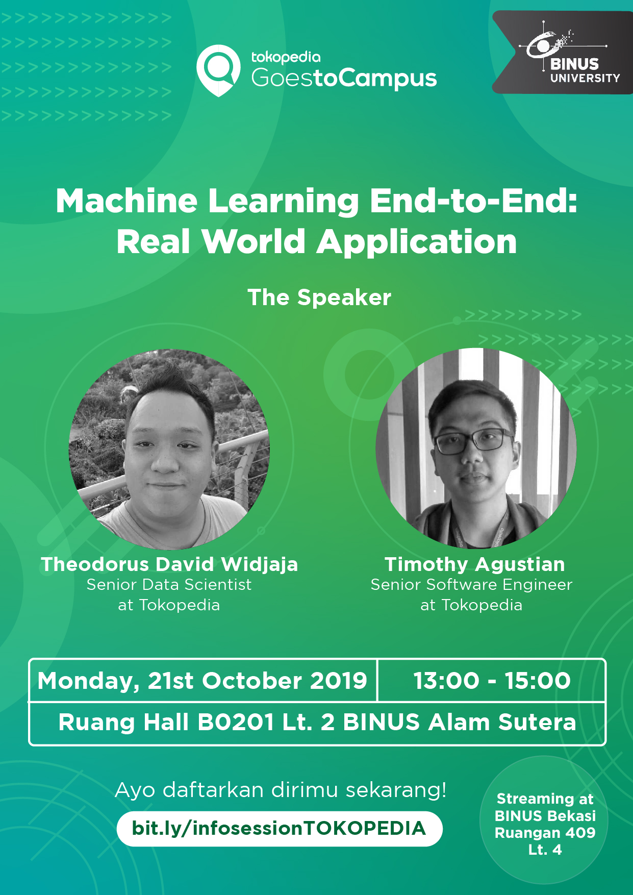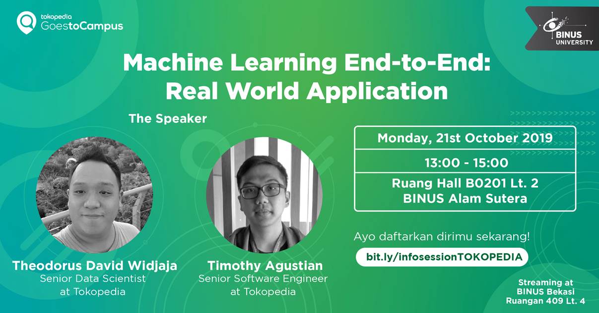 Bagi kamu mahasiswa BINUS Alam Sutera, jangan lewatkan kesempatan untuk mendapatkan pengetahuan terkini mengenai industri teknologi dari Tokopedia dengan tema "Machine Learning End-to-End: Real World Application".