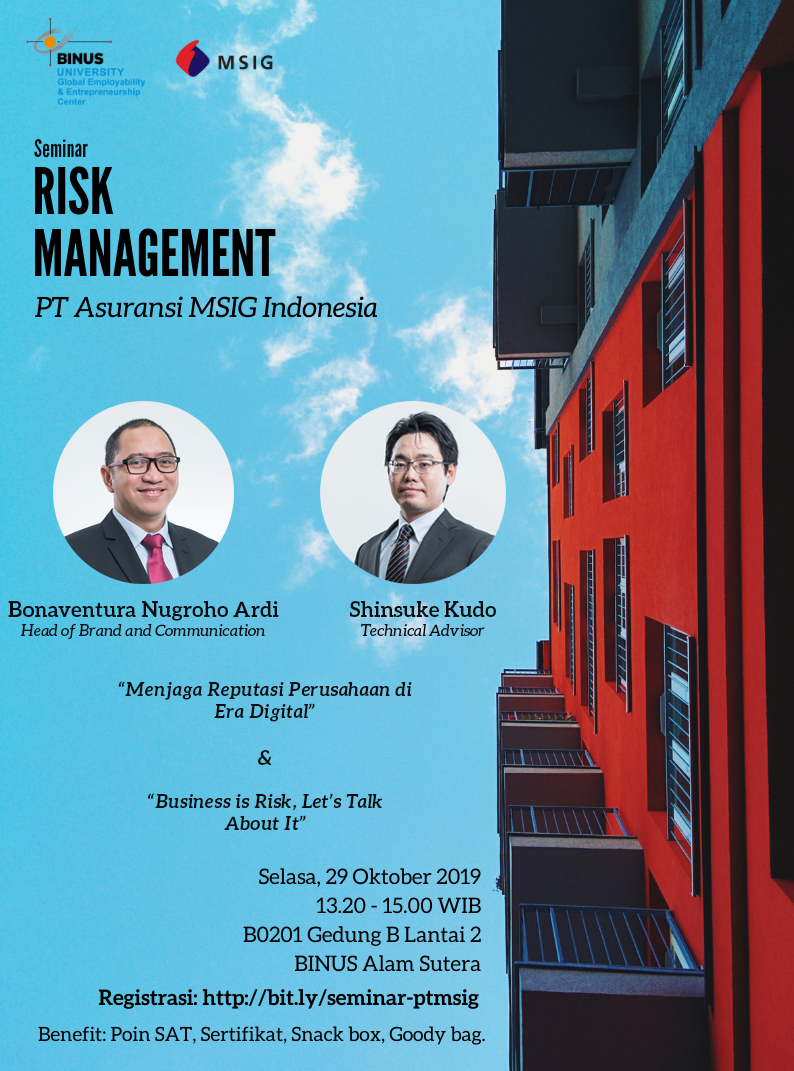 Kamu pernah mendengar mengenai Risk Management? Atau pernah bertanya-tanya gimana sih sebuah perusahaan bisa mengatasi masalah-masalah yang mungkin muncul? Cari tahu jawaban dari segala pertanyaan kamu di Seminar Risk Management yang akan diadakan oleh PT Asuransi MSIG Indonesia yuk! Perusahaan multinasional asal Jepang ini merupakan anak perusahaan dari Mitsui Sumitomo Insurance Group yang berpusat di Tokyo. Pada kesempatan kali ini mereka akan membahas 2 topik menarik yang wajib kamu ikuti, terlebih lagi resiko-resiko perusahaan yang kian muncul di era digital ini lho! Pembicaranya adalah Bonaventura Nugroho Ardi selaku Head of Brand and Communication dan Shinsuke Kudo selaku Technical Advisor dari PT MSIG Indonesia, cek jadwalnya berikut ya: