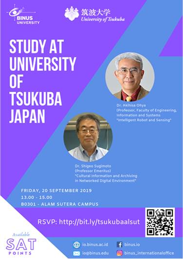 Ada apa aja agendanya? Sharing knowledge dari Dr. Akihisa Ohya yang ahli dalam Intelligent Robotics dan Intelligent Mechanics, kemudian ada Dr. Shigeo Sugimoto yang penelitiannya seputar Library and Information Science. Lalu ada scholarship information, sharing alumni, dan lainnya! Keren kan? Selain pengetahuan dan networking, kalian juga akan mendapatkan poin SAT lho! Yuk langsung daftar di http://bit.ly/tsukubaalsut!