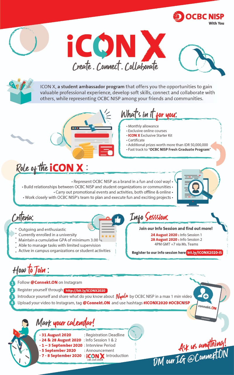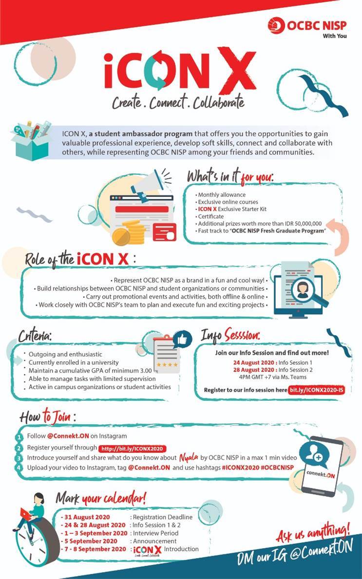 By being a part of ICONX! OCBC NISP's Student Ambassador program that aims to seek, inspire, and develop top talents among students to be our ambassadors in their communities and organizations.