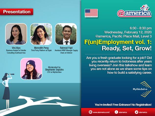 F(un)employment adalah talkshow dan gathering yang diselenggarakan oleh MyEduSolve Acara ini dimaksudkan bagi mereka yang masih bertanya-tanya mengenai langkah dalam kehidupan profesional. Karena tidak ada formula pasti untuk karier yang sukses. Pembicara yang kami undang adalah mereka yang mampu membagikan beragam perspektif mengenai perjalanan karier mereka.