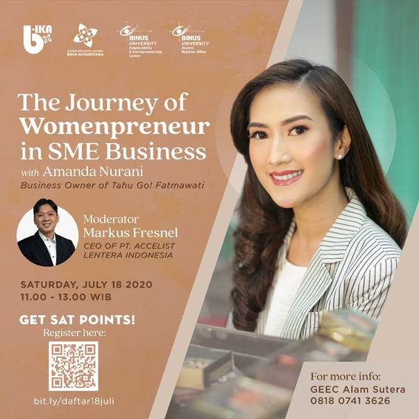 Dalam Webinar kali ini Amanda akan mengangkat sisi Entrepreneur Wanita (Womenpreneur), tips & trik menjalankan usaha serta tantangan dan keunggulan dalam menjalankan bisnis UMKM. Webinar ini juga akan di-Moderatori oleh Pak Markus Fresnel sebagai CEO PT Accelist Lentera Indonesia dan juga ketua B-IKA Community.
